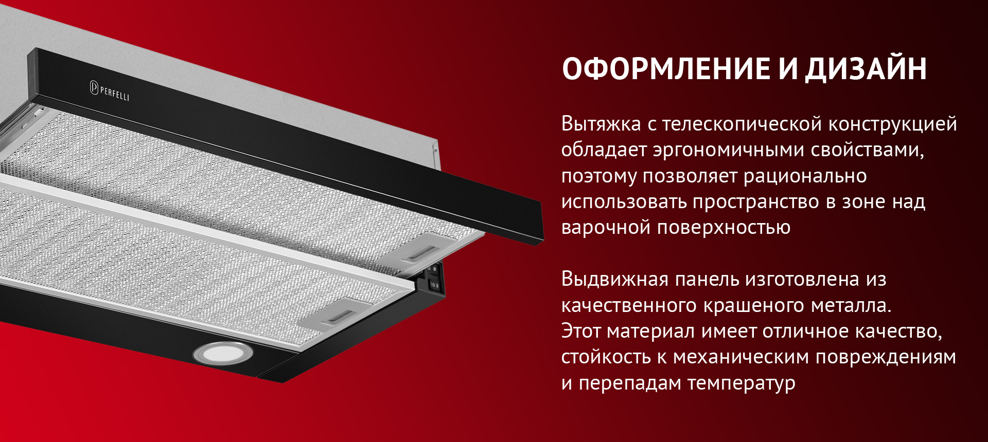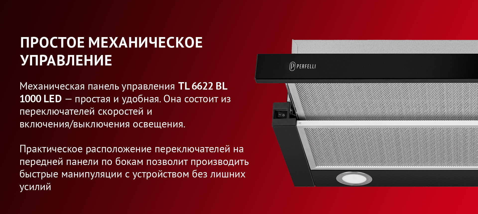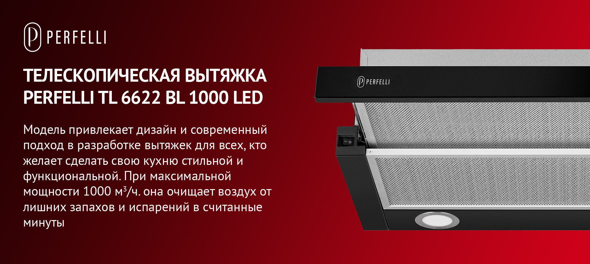 Телескопическая кухонная вытяжка Perfelli TL 6622 BL 1000 LED обладает эргономичными свойствами, поэтому позволяет рационально использовать пространство в зоне над варочной поверхностью. Конфигурация модели включает: