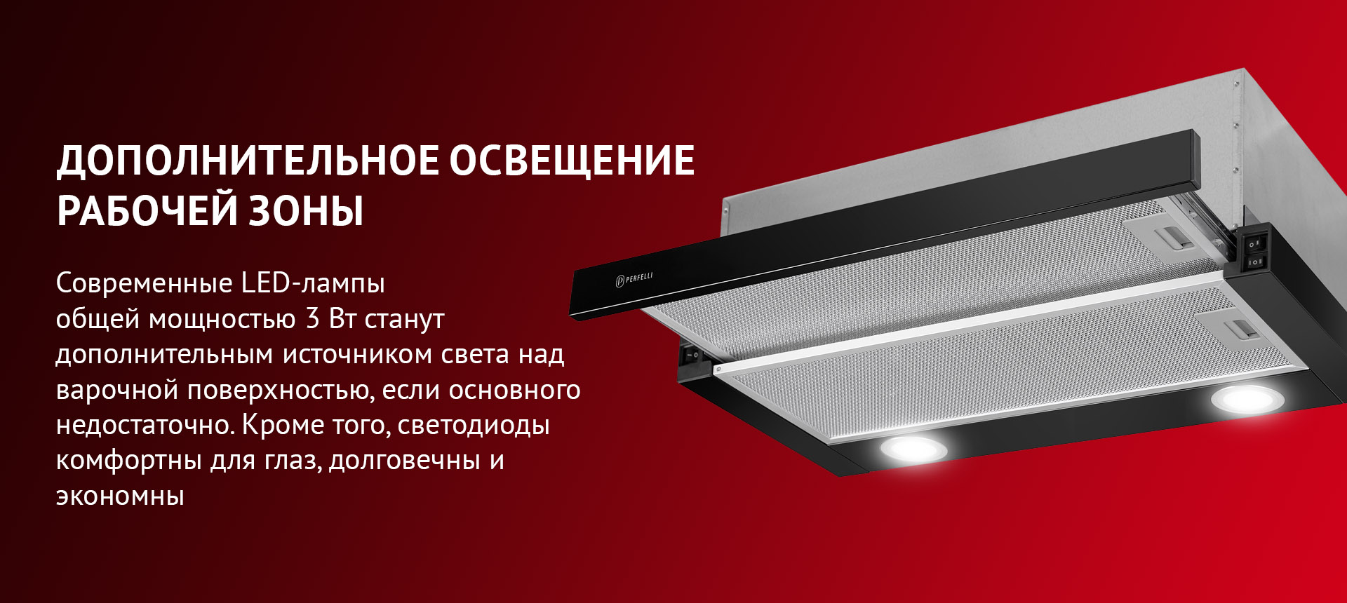 Освещение вытяжки состоит из двух LED-ламп мощностью по 1.5 Вт, которые расположены на задней части вытяжки и способствуют лучшему освещению рабочей поверхности. Подсветка является комфортной для глаз и работает как дополнительный источник освещения на кухне. Рабочий ресурс светодиодов в разы выше, чем у обычных ламп, а потребление энергии минимально. Кроме того, светодиоды достаточно выносливы во время активной эксплуатации.