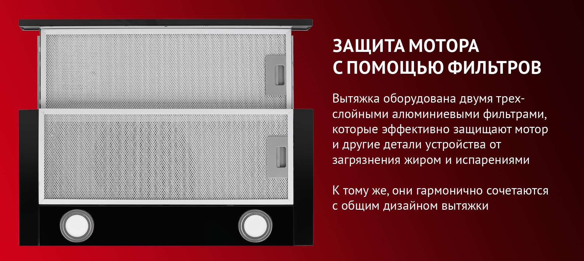 Вытяжка оборудована двумя трехслойными алюминиевыми фильтрами, эффективно защищающими мотор и другие детали устройства от загрязнения жиром и испарениями. Их можно легко вымыть в теплой мыльной воде или посудомоечной машине.