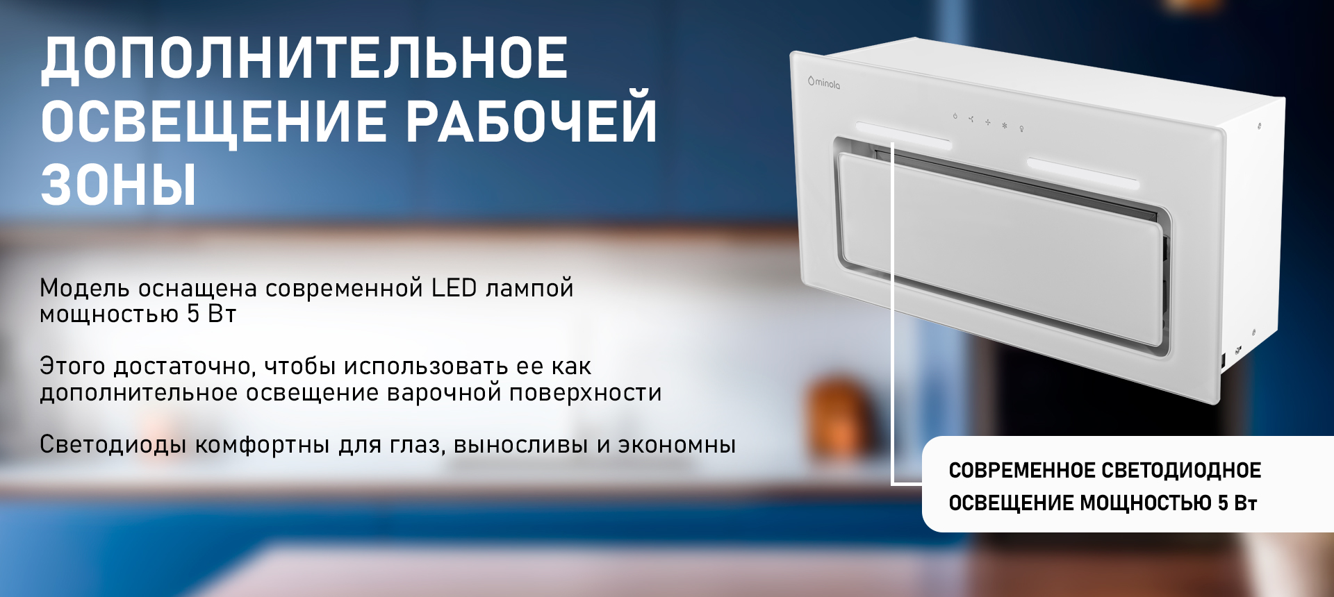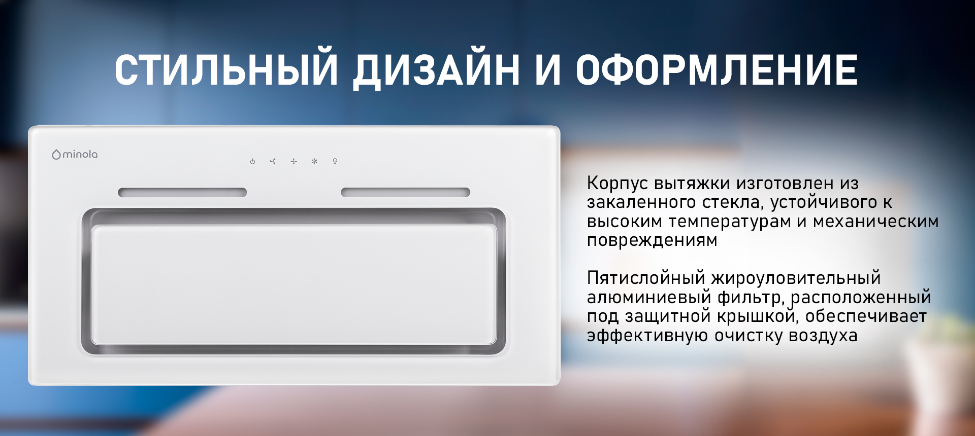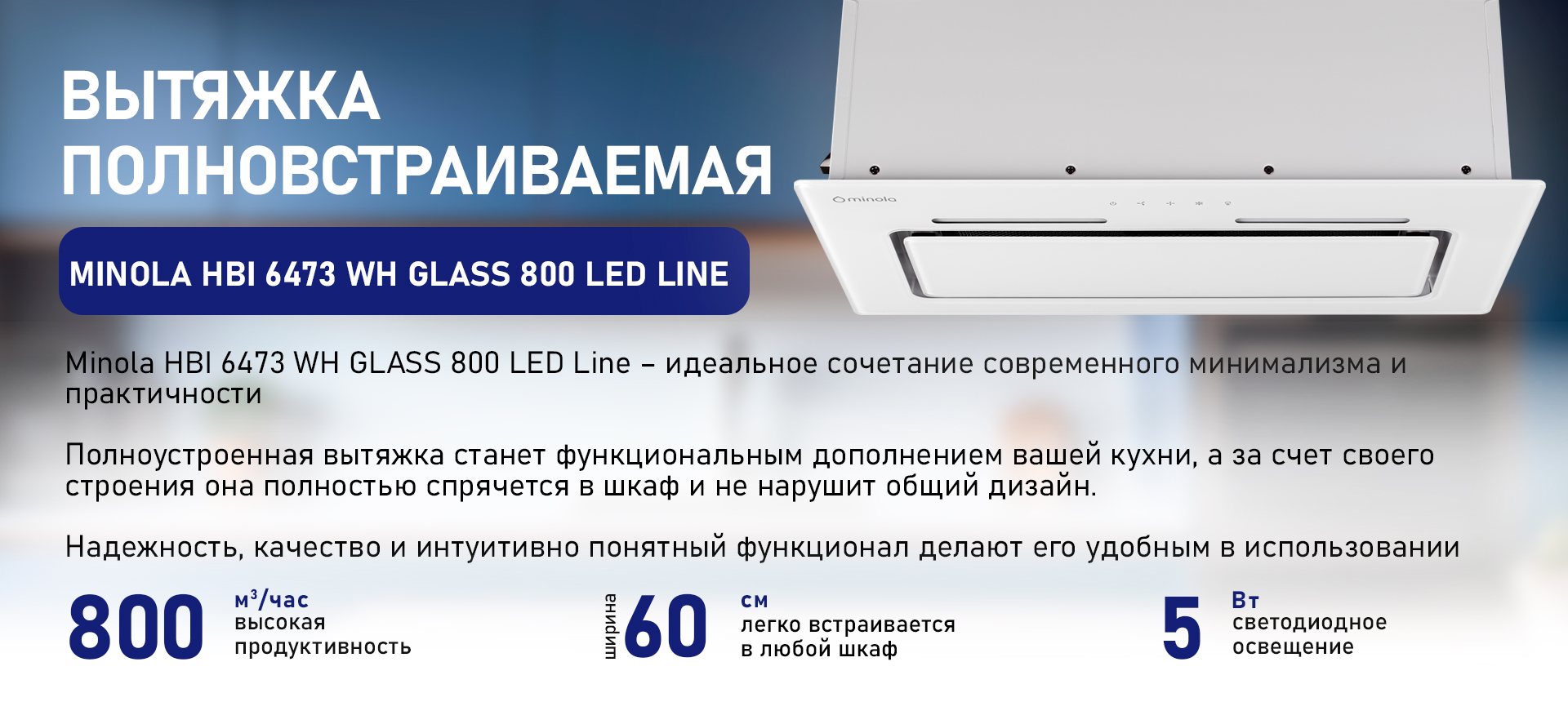Благодаря превосходным эргономичным качествам, которыми наделена модель Minola HBI 6473 WH GLASS 800 LED Line, она подойдет как маленькой, так и стандартной кухне. Часть конструкции устройства, которая должна быть скрыта от глаз, полностью прячется в шкафу, а рабочая часть остается на виду и органически дополняет общий дизайн.