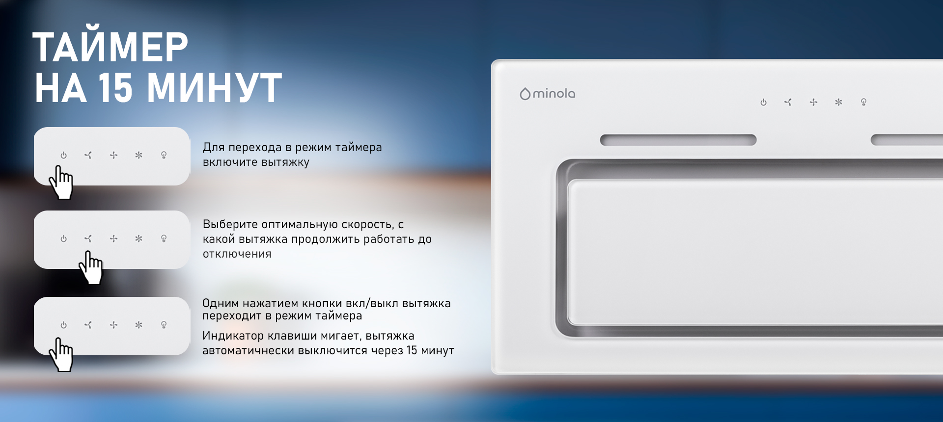 После включения таймера вытяжка будет работать в течение 15 минут, а затем автоматически отключится. Это очень удобно, так как позволяет не беспокоиться о том, чтобы вручную выключить вытяжку после приготовления пищи.