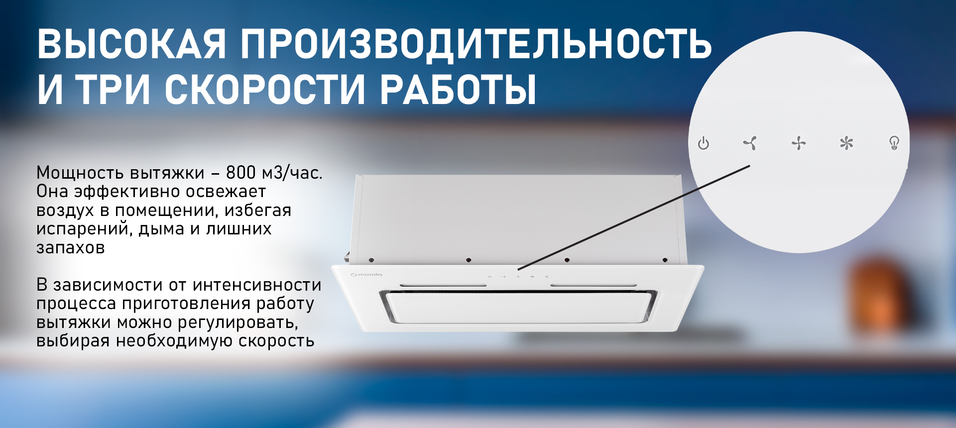 Вытяжка имеет 3 скорости работы. Необходимая скорость выбирается исходя из интенсивности загрязнения воздуха в кухне. Каждой скорости характерна разная производительность: