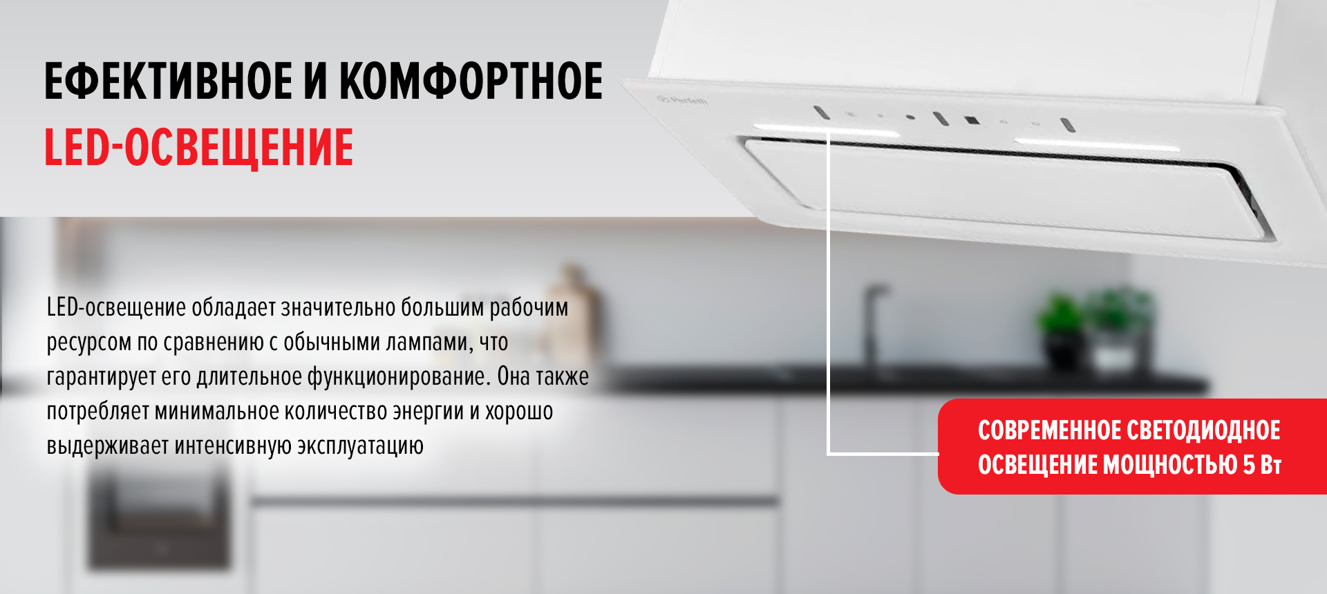 Современное освещение вытяжки обеспечивается одной светодиодной лентой мощностью 5 Вт. Эта подсветка удобна для глаз и служит дополнительным источником света на кухне, обеспечивая яркое освещение для приготовления любимых блюд и добавляя уют вашему кухонному пространству.