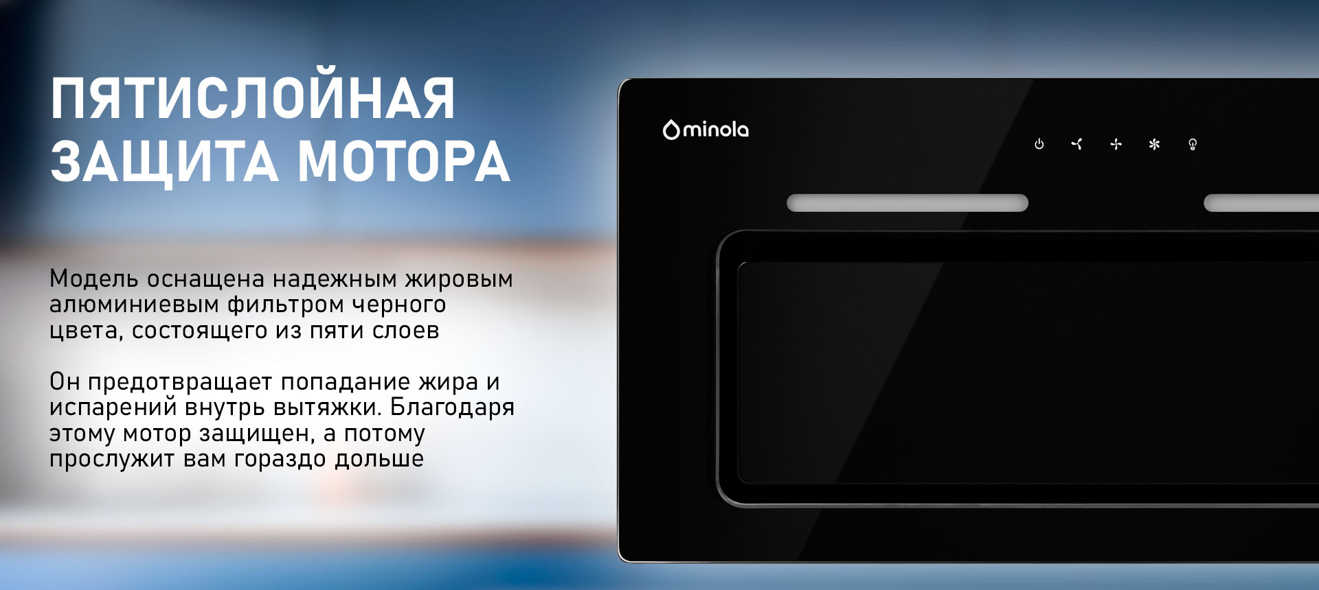 Кухонная вытяжка оборудована пятислойным жировым алюминиевым фильтром. Он обеспечивает надежную и эффективную защиту двигателя и других деталей вытяжки от попадания жира и грязи.