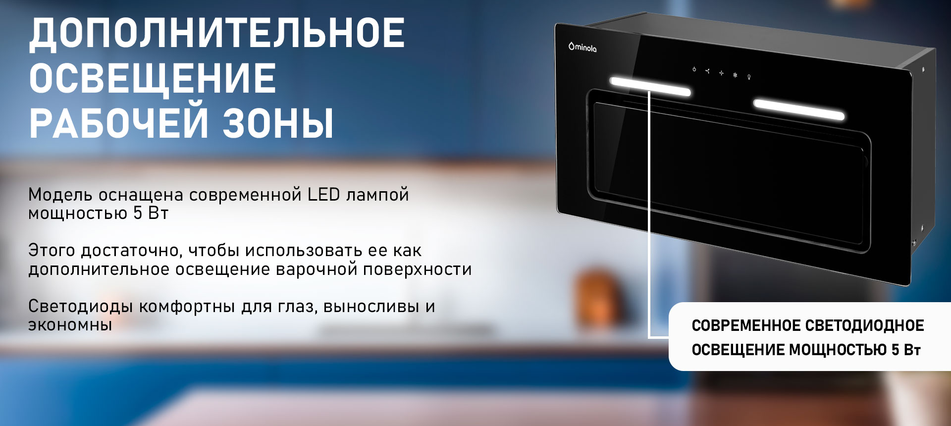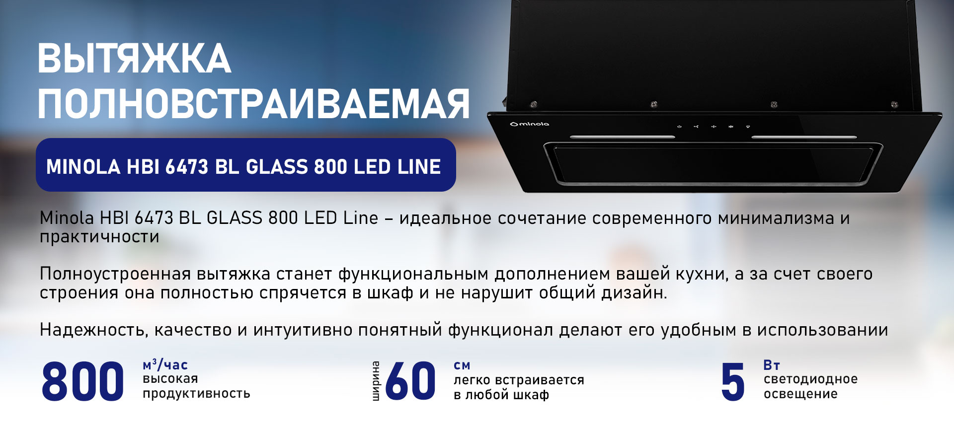 Благодаря превосходным эргономичным качествам, которыми наделена модель Minola HBI 6473 BL GLASS 800 LED Line, она подойдет как маленькой, так и стандартной кухне. Часть конструкции устройства, которая должна быть скрыта от глаз, полностью прячется в шкафу, а рабочая часть остается на виду и органически дополняет общий дизайн.