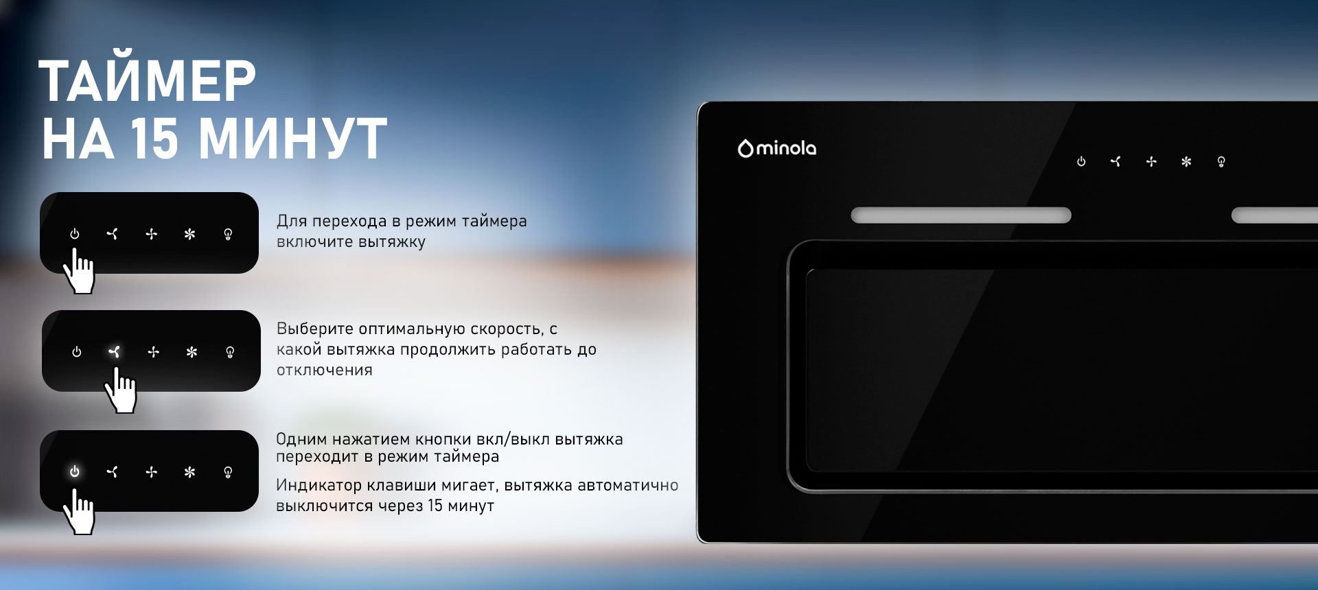 После включения таймера вытяжка будет работать в течение 15 минут, а затем автоматически отключится. Это очень удобно, так как позволяет не беспокоиться о том, чтобы вручную выключить вытяжку после приготовления пищи.
