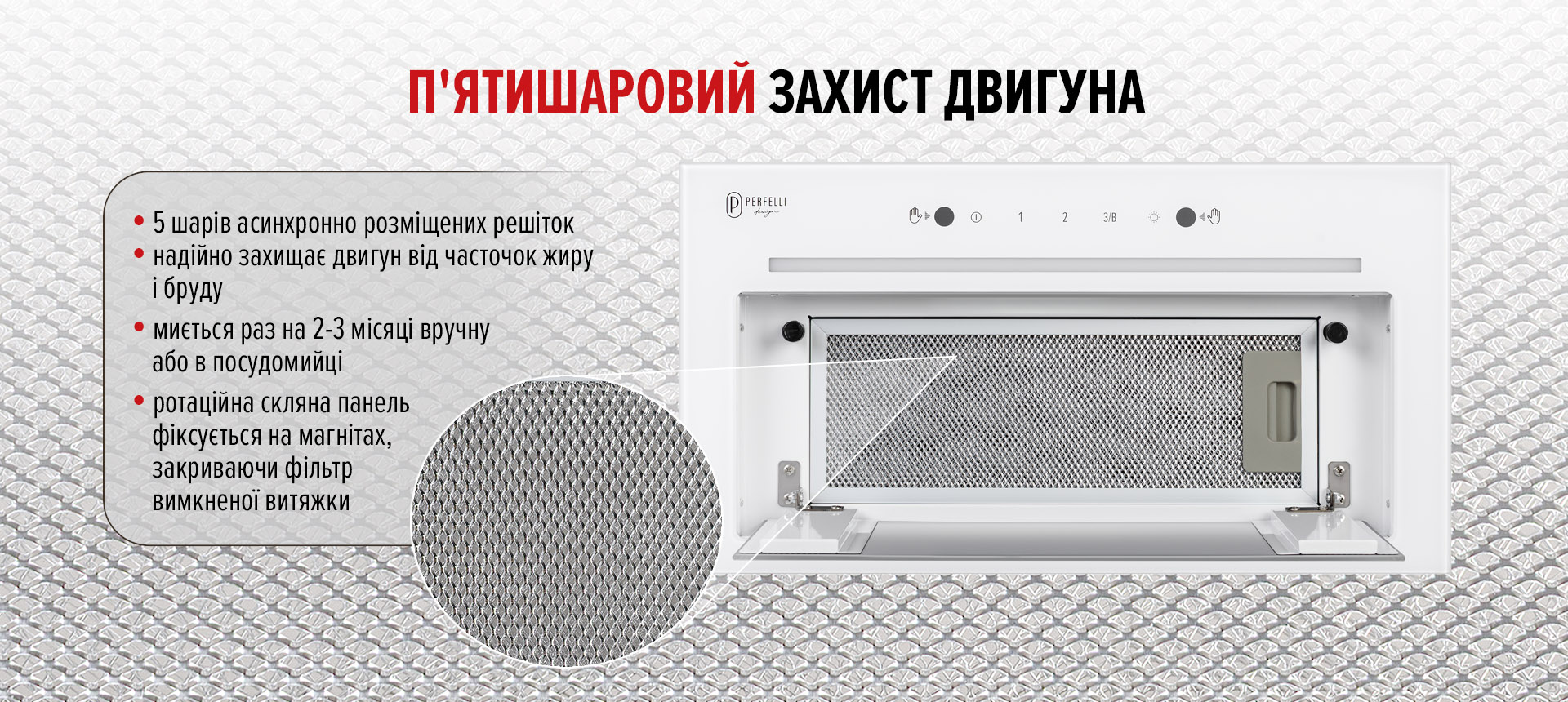- Алюминиевый пятислойный фильтр – задерживает жир и легко очищается.