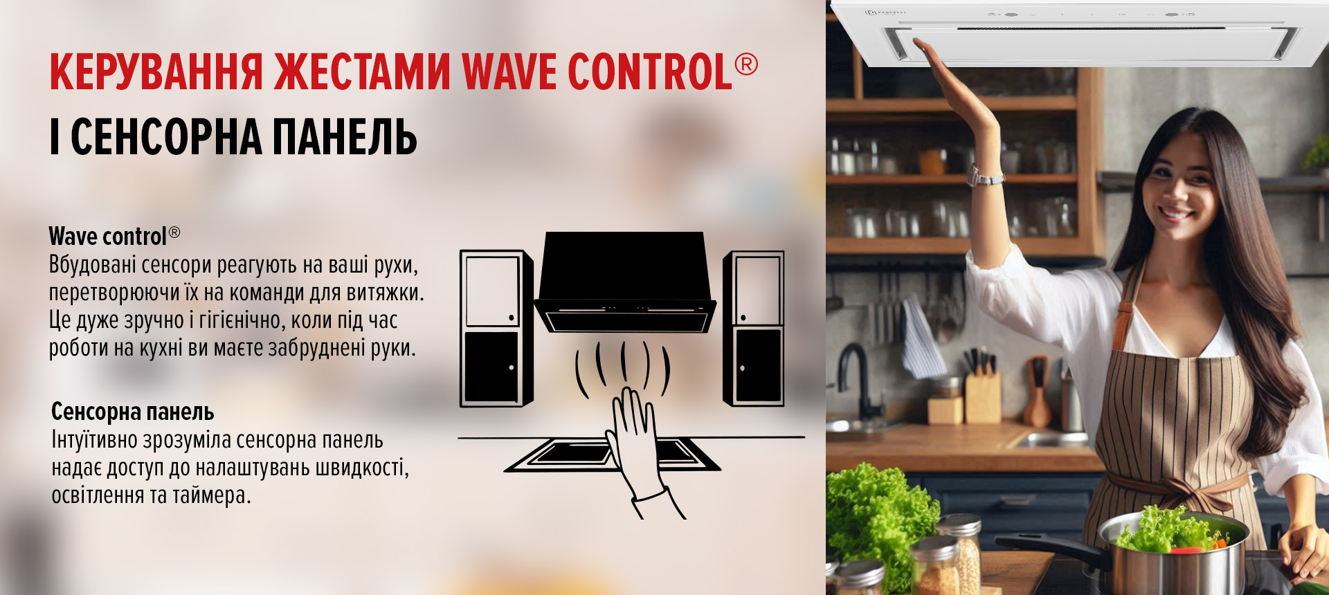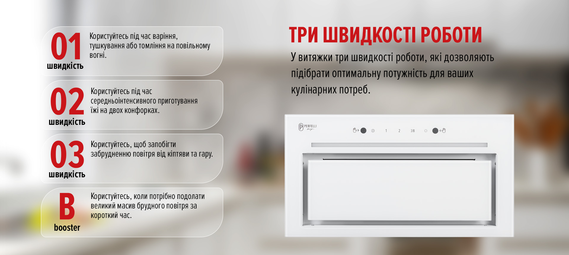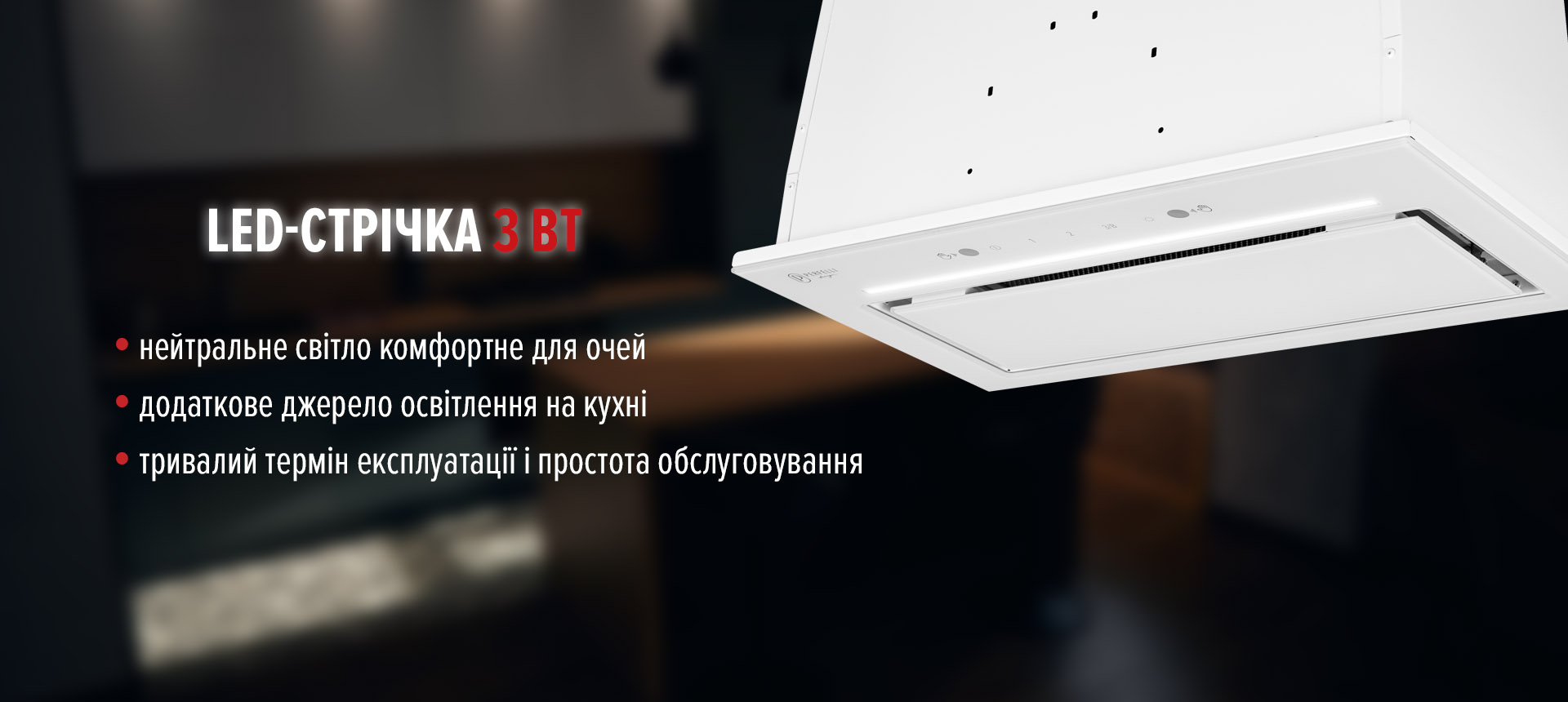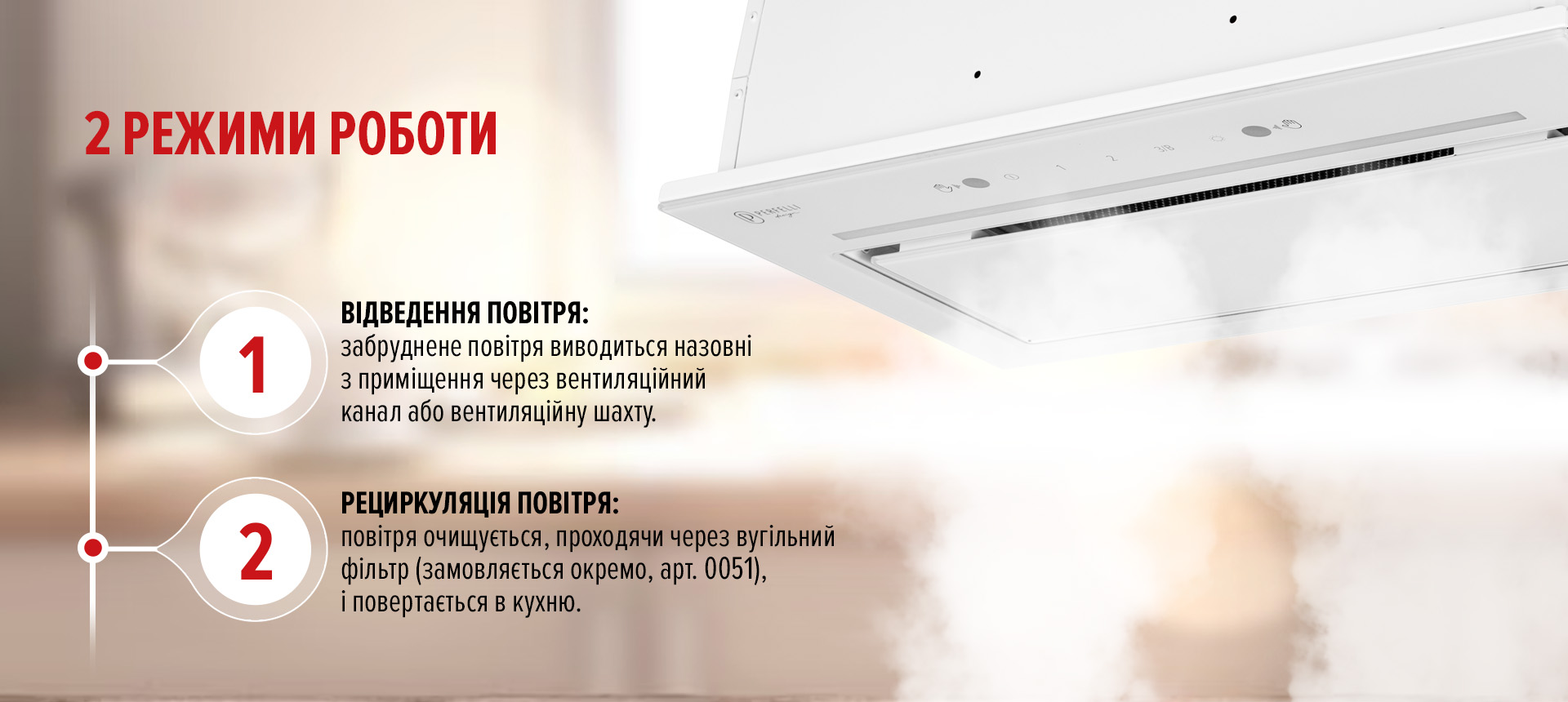 Корпус выполнен из крашеного металла, а фасад – из закаленного стекла.Стеклянная крышка перекрывает зону фильтра, оставляя небольшой зазор для забора воздуха. Это позволяет сохранять чистоту, простоту в уборке и визуальную лёгкость на кухне.