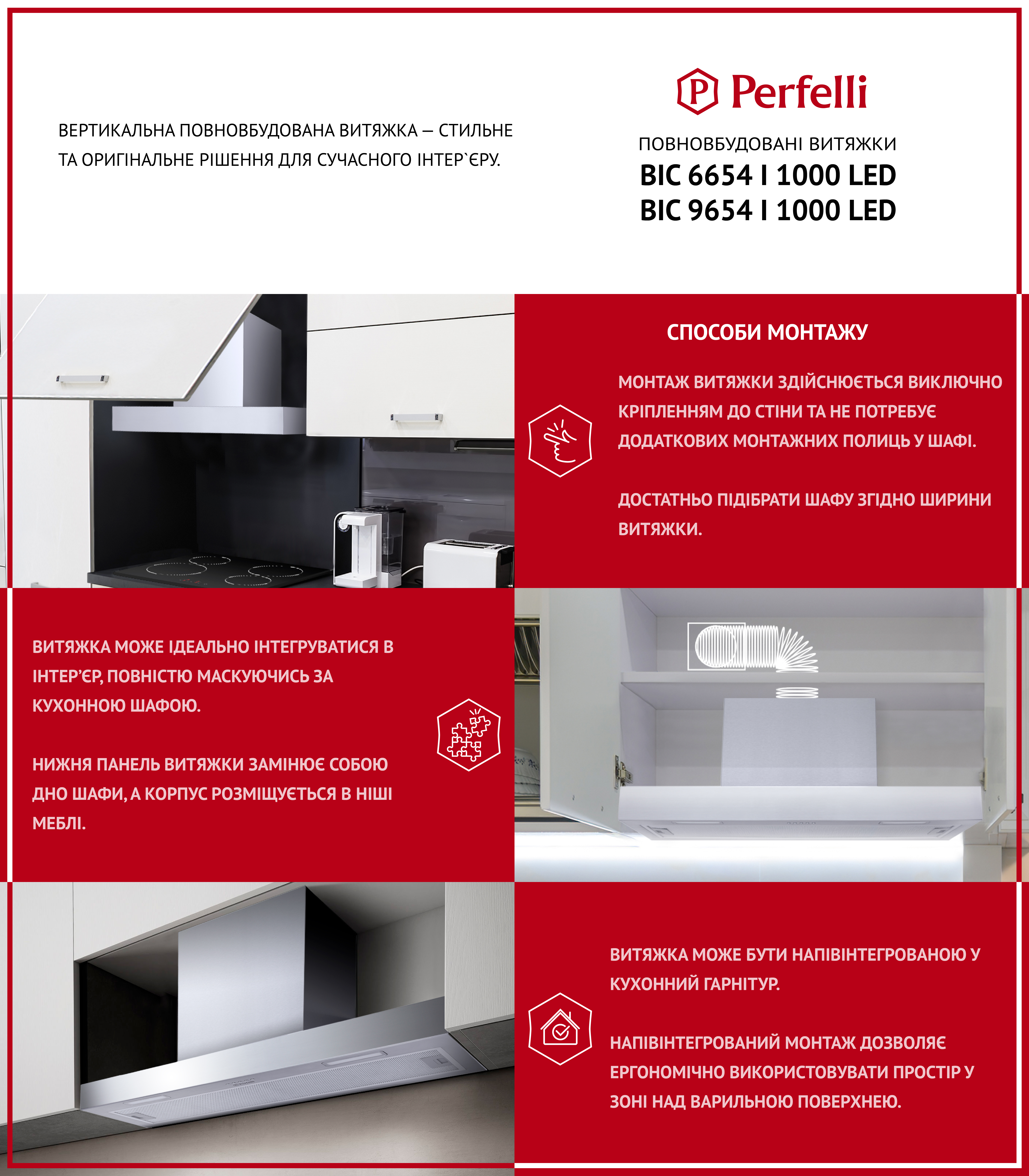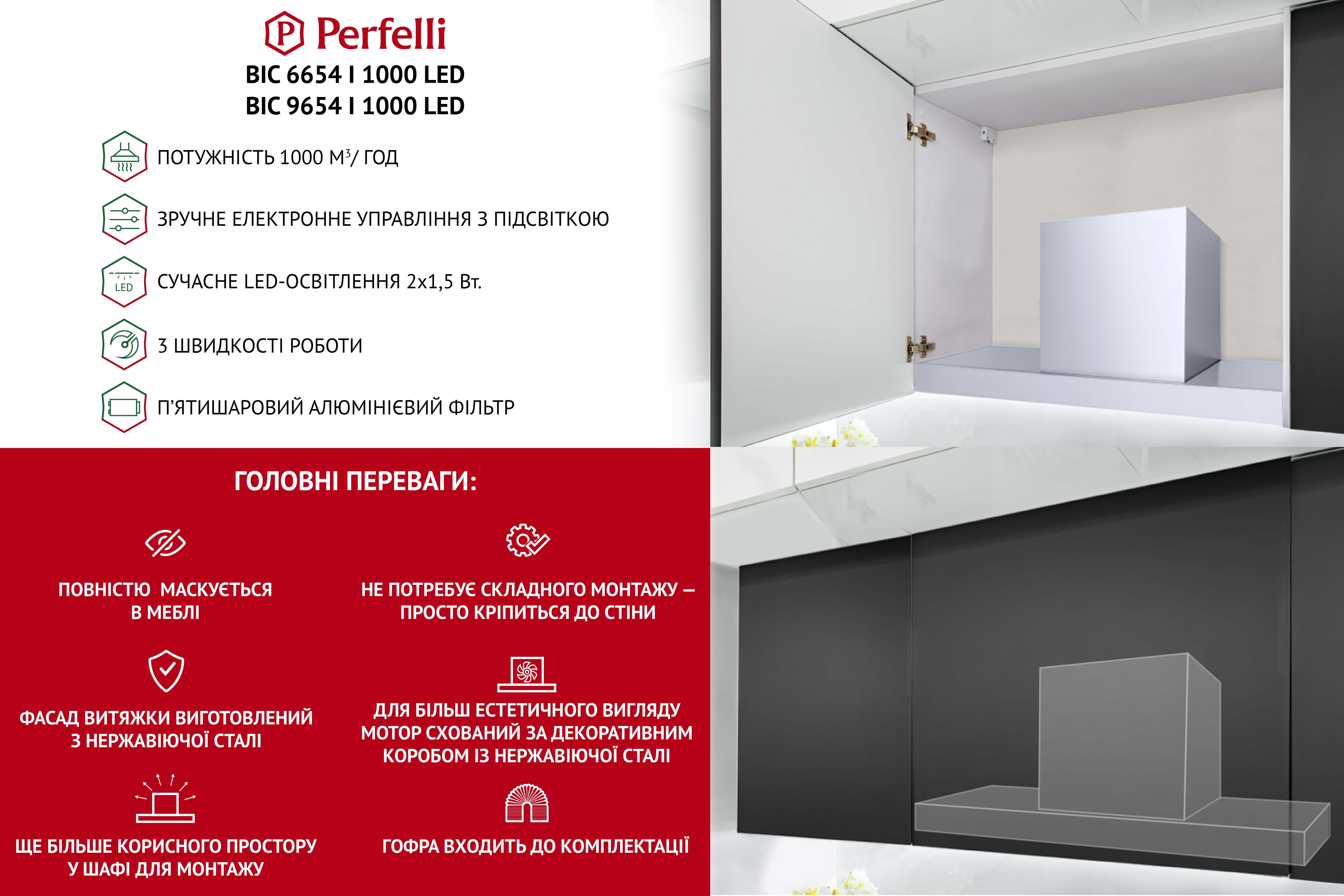 Головна перевага моделі полягає в тому, що її монтаж здійснюється виключно кріпленням до стіни та не потребує додаткових монтажних втручань. Достатньо просто підібрати кухонну шафу згідно ширини витяжки. У такому разі, витяжка ідеально інтегрується в інтер’єр, повністю маскуючись за шафою.