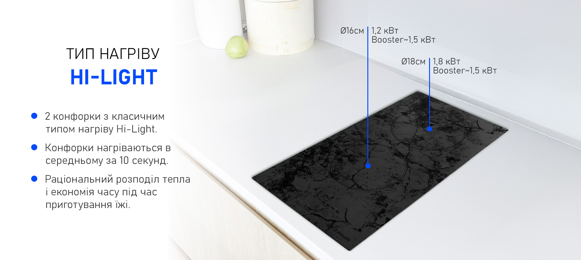 - Потужність конфорок: Передня – 1.2 кВт (Booster 1.5), Задня – 1.8 кВт (Booster 2.0)