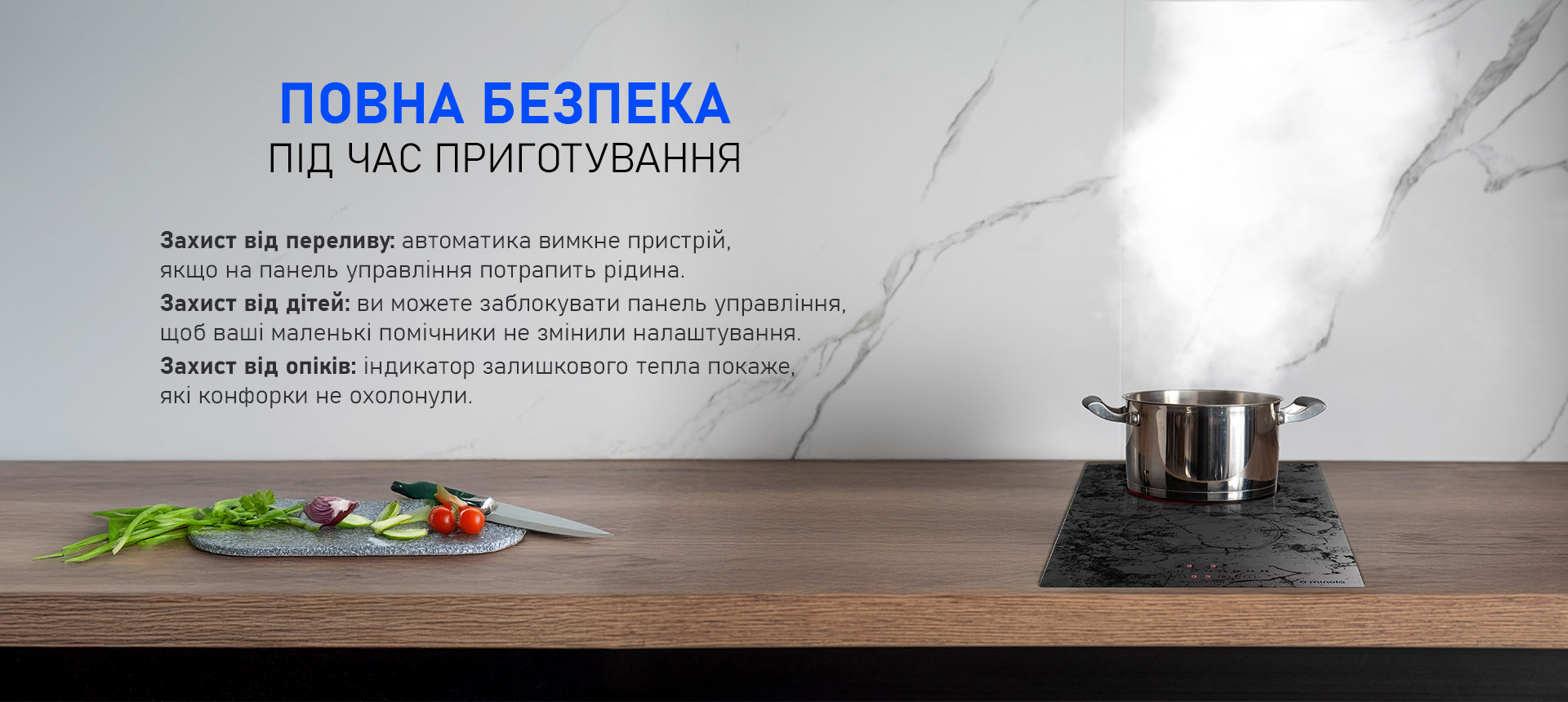 - Автовідключення при переливі автоматично вимикає поверхню, якщо рідина потрапляє на панель сенсорних елементів. Такий захист підвищує безпеку використання і знижує ризик поломки.