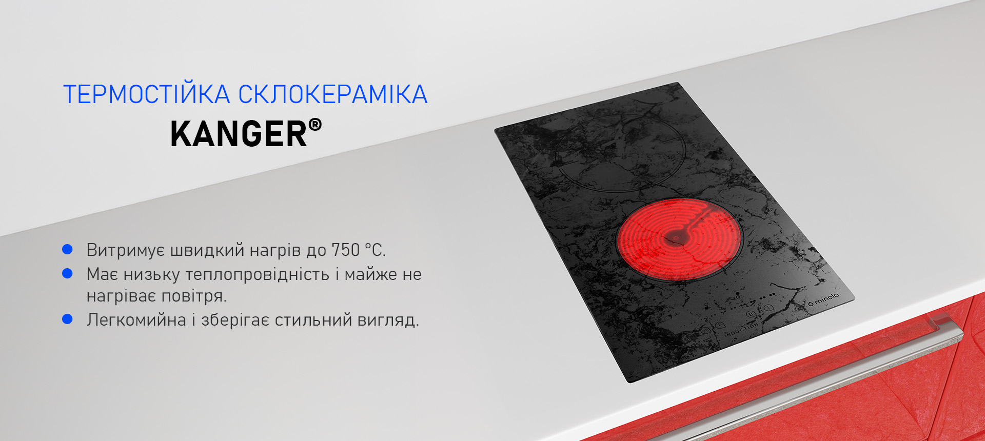 - Поверхня виготовлена зі склокераміки Kanger, яка має високу стійкість до термічних і механічних навантажень.