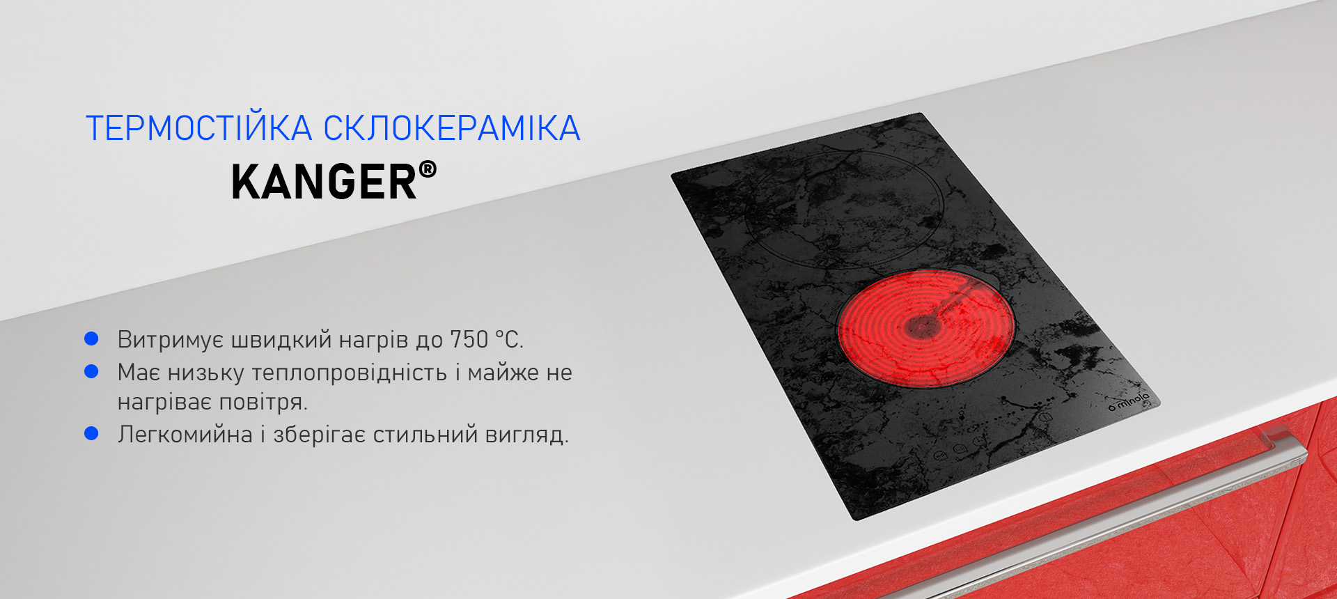 - Матеріал поверхні: Склокераміка Kanger, мармурова текстура