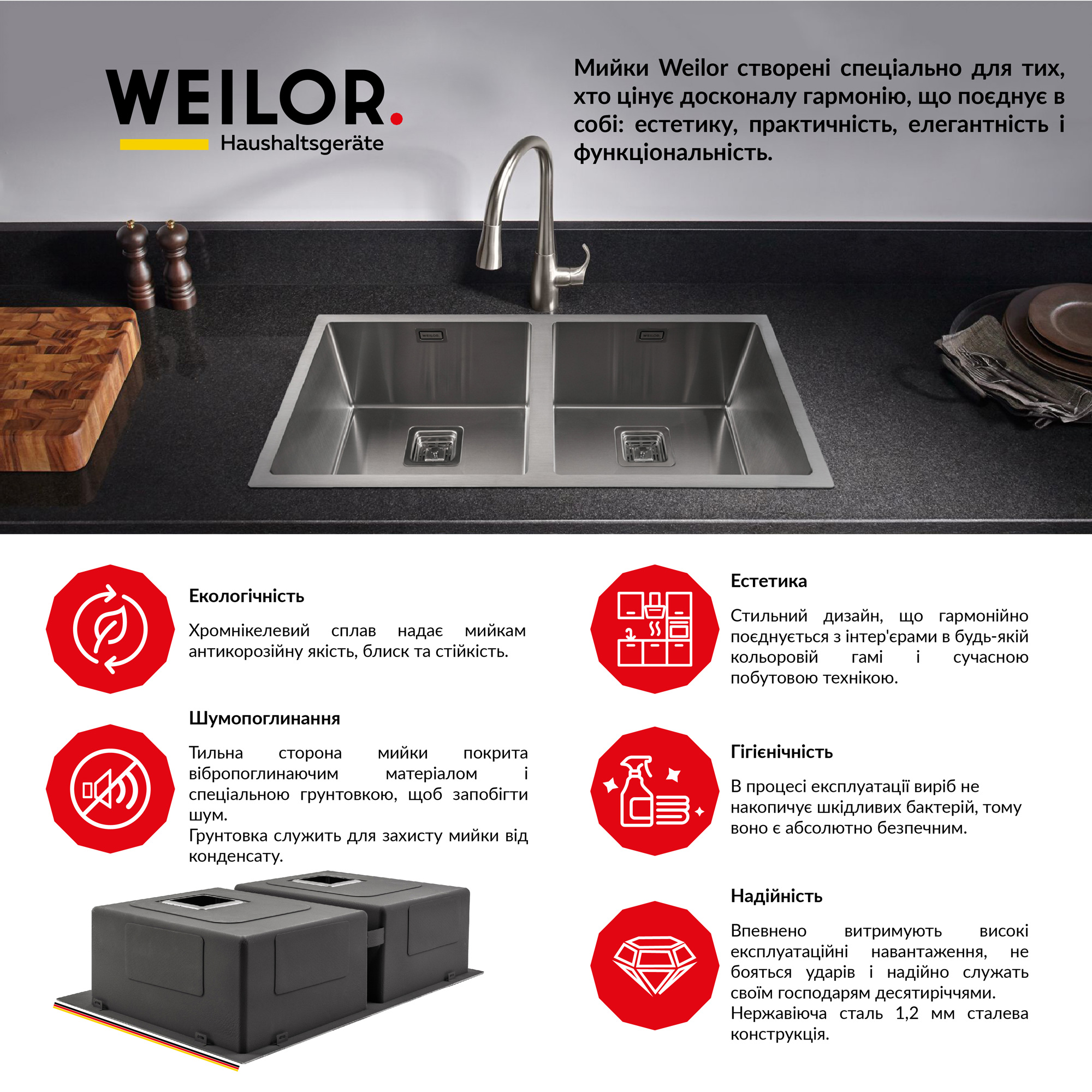 Високоякісна харчова нержавіюча сталь європейського стандарту AISI 304 (18/10), що містить в собі 18% хрому і 10% нікелю - визнана еталоном на професійних кухнях по всьому світу і використовується для забезпечення найкращих характеристик кожного виробу ТМ "Weilor". Кухонна мийка з нержавіючої сталі підходить до будь-якого дизайнерського рішення, має великий обсяг і максимально корисну площу дна чаші. В процесі експлуатації виріб не накопичує шкідливих бактерій, тому воно є абсолютно безпечним. Хромонікелевий сплав надає мийкам антикорозійну якість, блиск та стійкість. Мийка з нержавіючої сталі не вимагає використання додаткових засобів для особливого догляду за виробом.