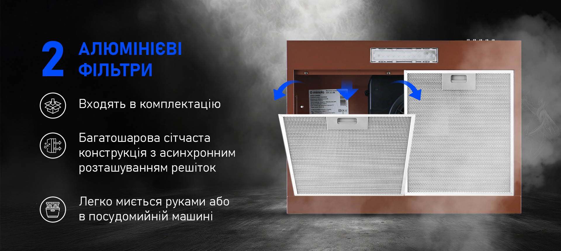 Для підтримки ефективної роботи потрібно регулярно знімати і мити обидва алюмінієві жировловлюючі фільтри вручну або у посудомийній машині. Корпус слід протирати м’якою тканиною з нейтральним засобом, уникаючи жорстких і абразивних речовин. Регулярний догляд подовжує термін служби пристрою і зберігає його зовнішній вигляд на високому рівні.