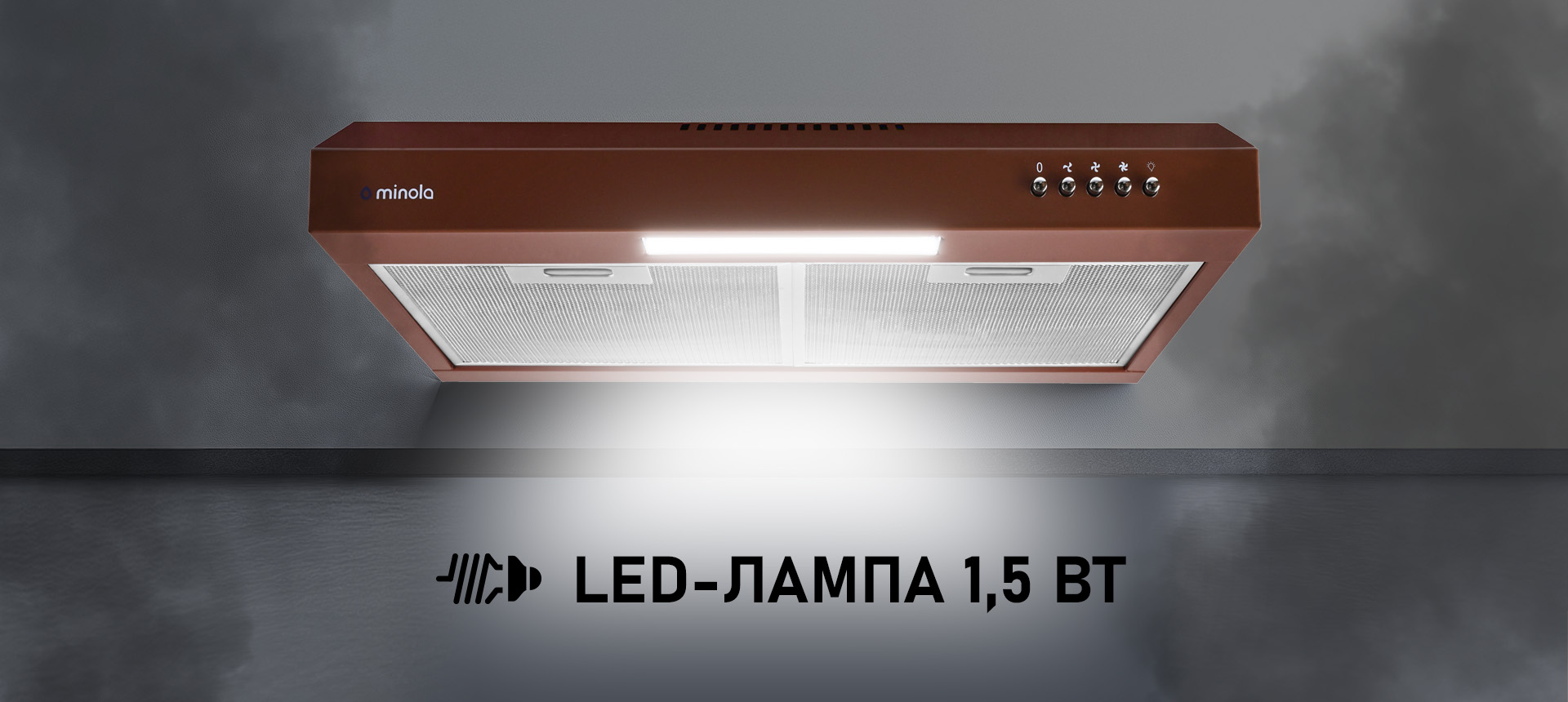 Корпус виготовлений з металу з якісним порошковим фарбуванням у глибокий коричневий колір, що забезпечує стійкість до зношування і привабливий вигляд. Плоска форма і лаконічні лінії дизайну роблять витяжку універсальною для різних стилів інтер’єру, додаючи тепла і природності кухонному простору. Матеріали легко очищаються і зберігають свій вигляд протягом багатьох років.