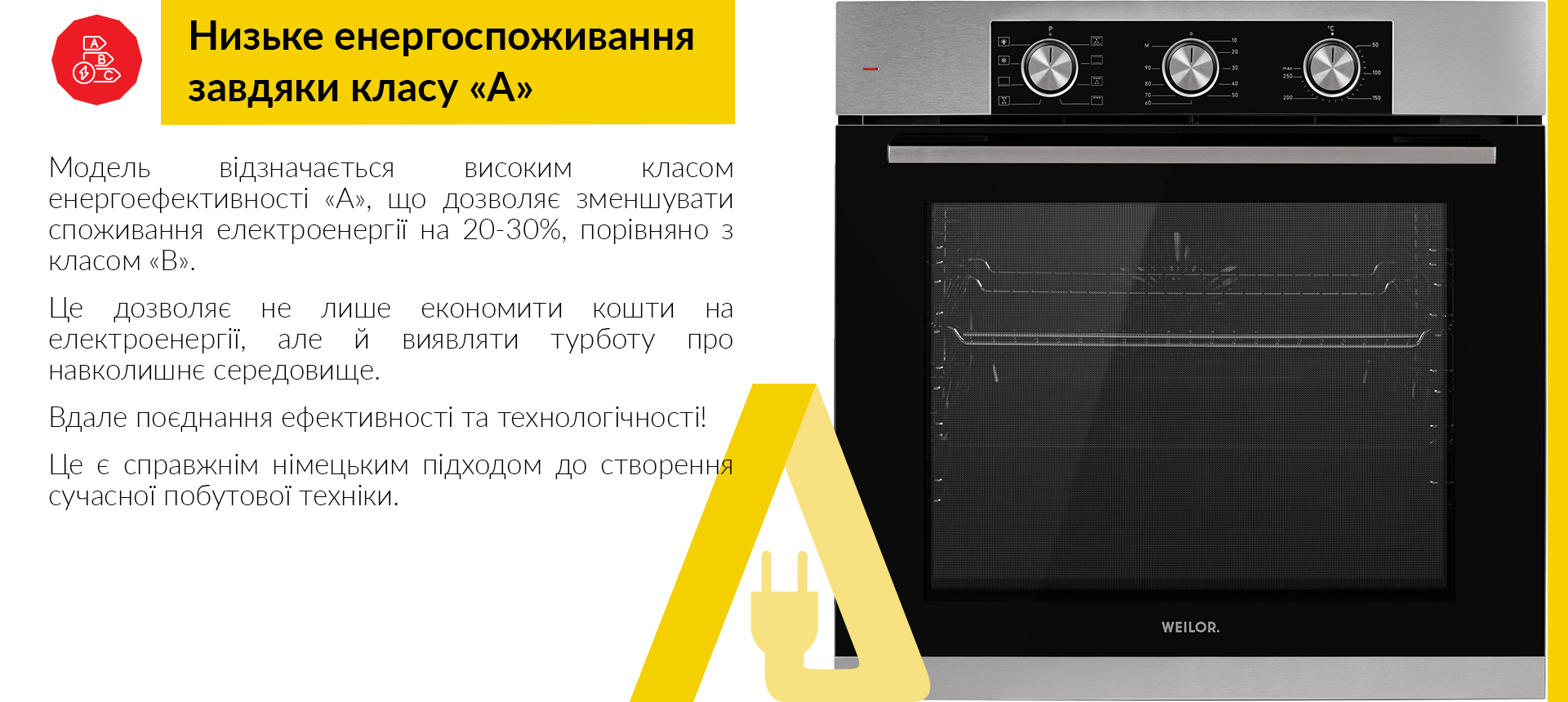 • Клас енергоспоживання «А», найекономічніший показник споживання енергії.