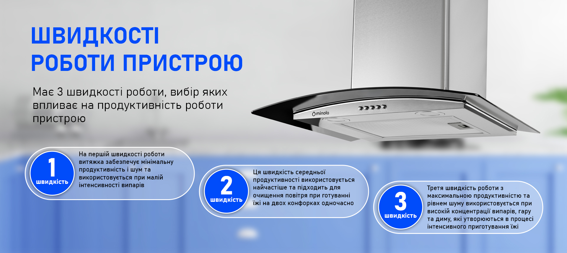 - На першій швидкості роботи витяжка забезпечує мінімальну продуктивність і шум та використовується при малій інтенсивності випарів;
