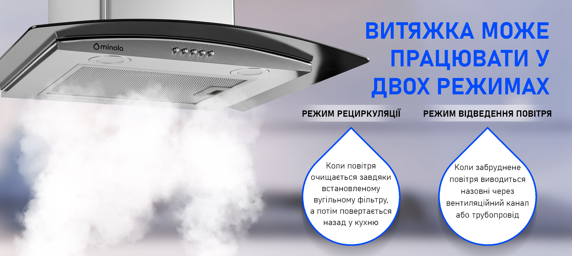 *Використання режиму рециркуляції витяжки можливе лише після встановлення вугільного фільтра, який продається окремо. Для вашої витяжки також можна підібрати відповідний вугільний фільтр від виробника minola.ua.
