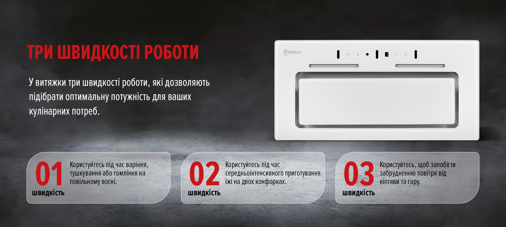 Витяжка оснащена трьома швидкісними режимами, що дозволяє підібрати оптимальну потужність для будь-яких умов приготування їжі.