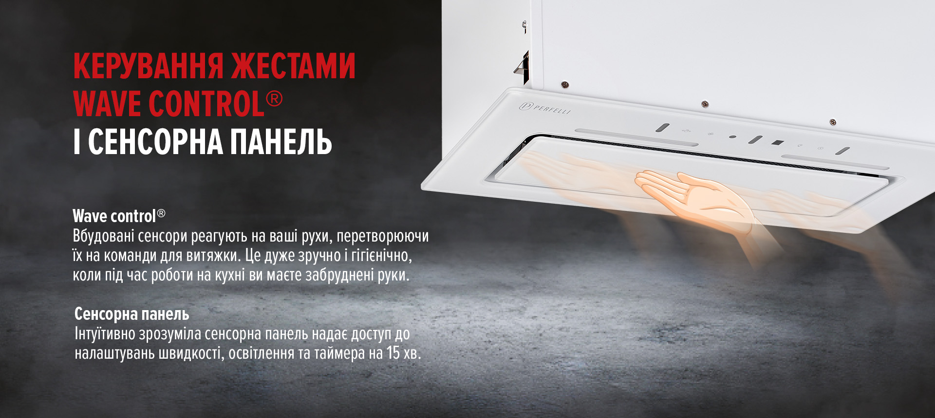 Вбудовані датчики в технології Wave Control реагують на ваші рухи, перетворюючи їх на команди для витяжки. Це дозволяє змінювати режими роботи без дотику, що особливо зручно у разі, якщо у вас забруднені руки. Сенсорна панель доповнює цю функцію, надаючи швидкий доступ до налаштувань потужності, освітлення та таймера.