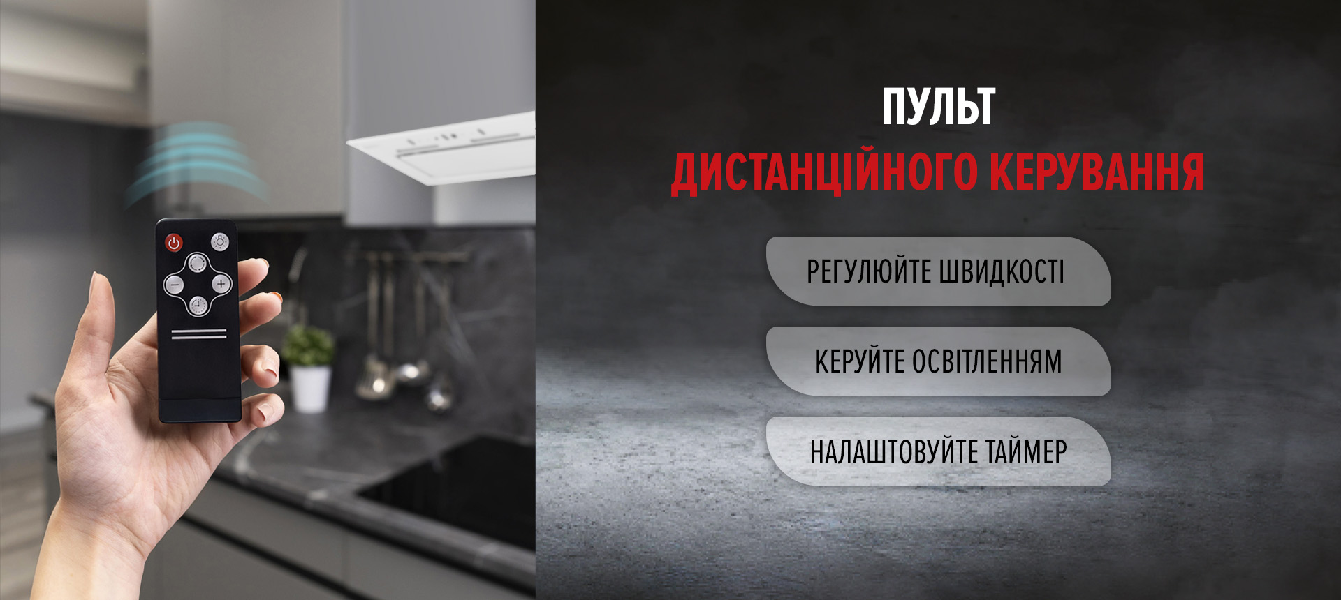 Пульт дистанційного керування – це елемент розумної кухні, що робить ваше життя простішим і комфортнішим. Він забезпечує зручне керування витяжкою на відстані, незалежно від її розташування, підвищуючи ефективність та комфорт під час приготування їжі.