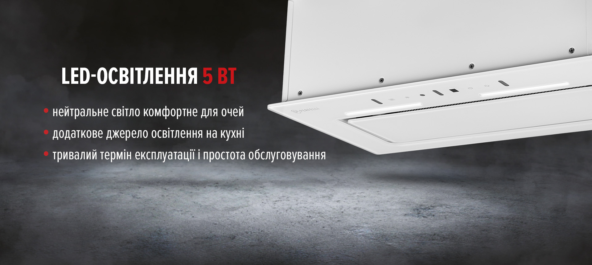 Сучасне освітлення витяжки забезпечується однією світлодіодною стрічкою потужністю 5 Вт. Це підсвічування комфортне для очей та служить додатковим джерелом світла на кухні, забезпечуючи яскраве освітлення для приготування улюблених страв і додаючи затишку вашому кухонному простору.