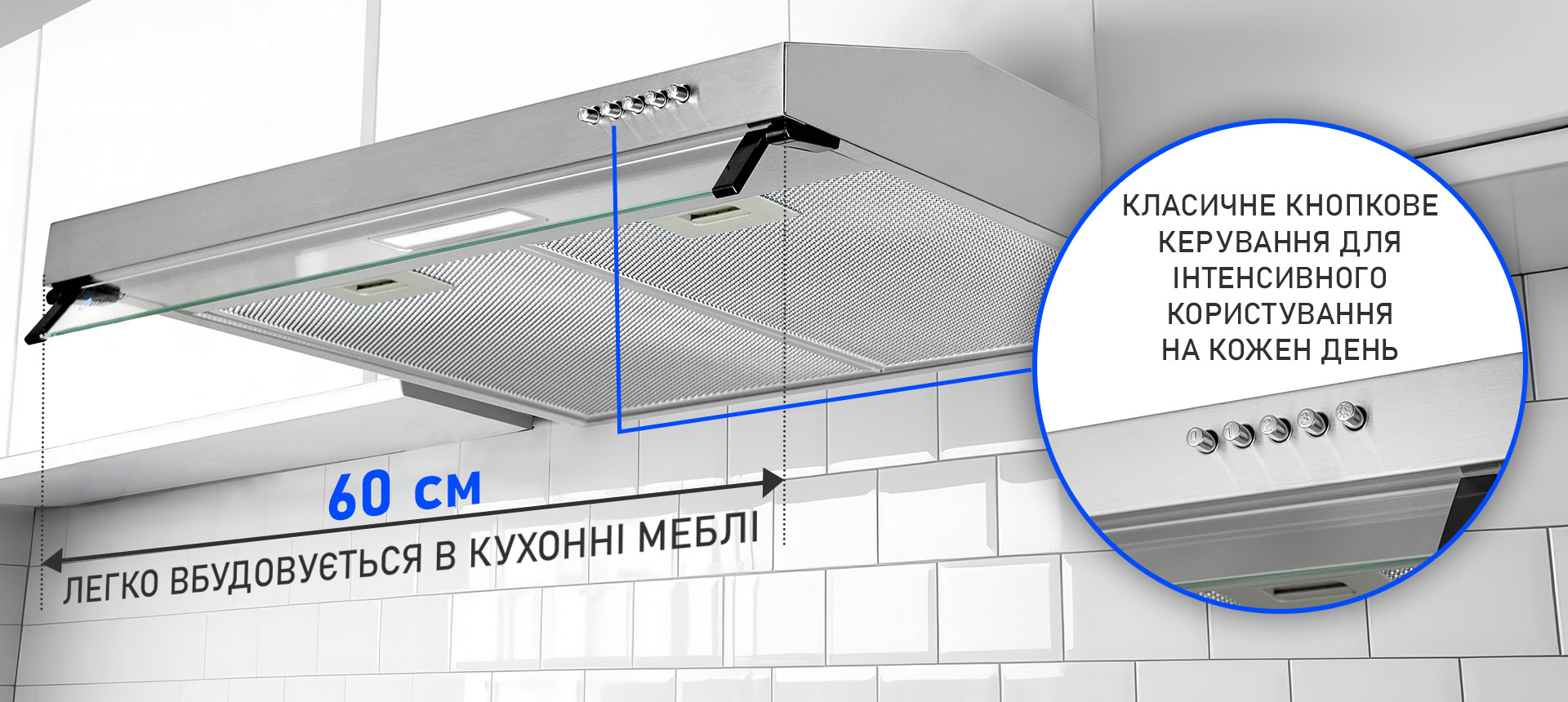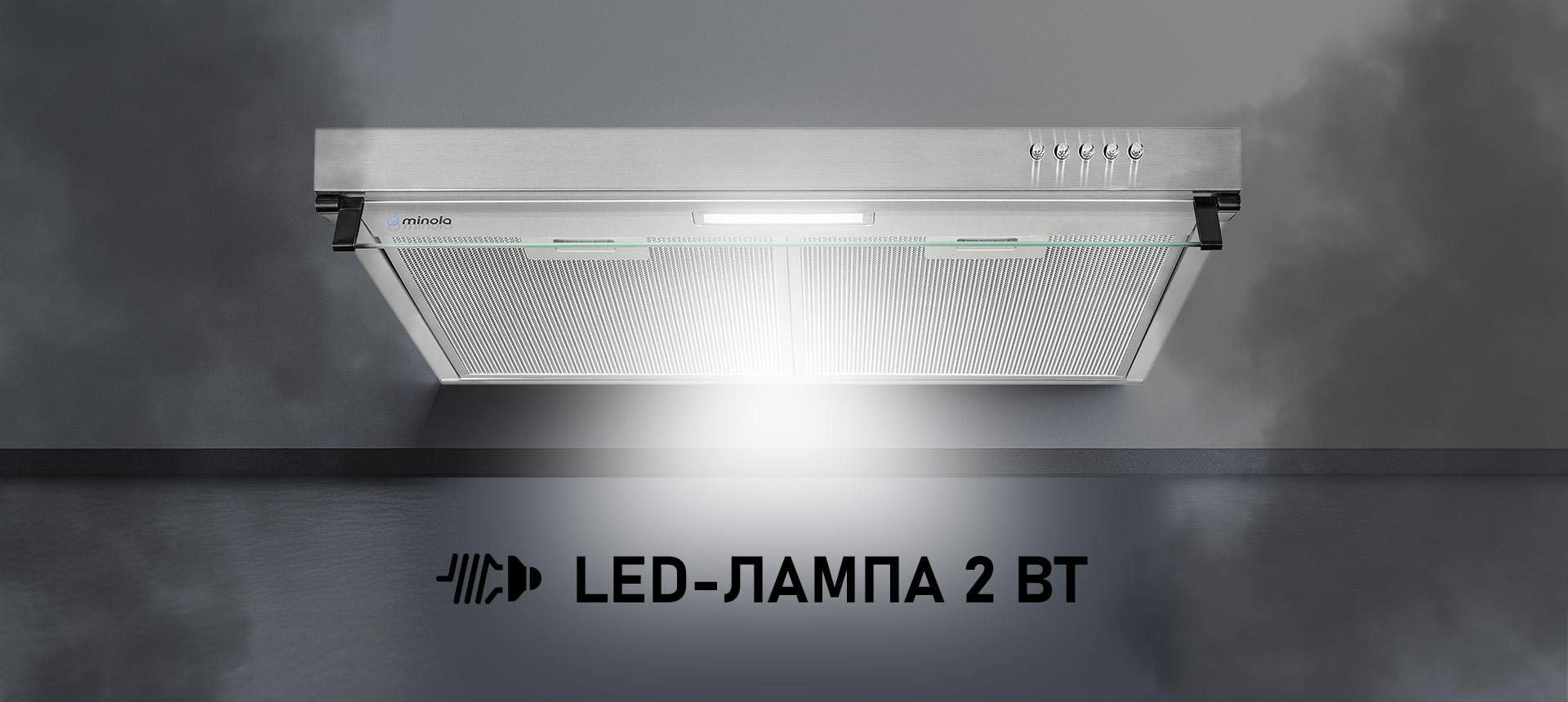 Завдяки механічному керуванню Minola HPL 633 управляється інтуїтивно зрозуміло і зручно. Натискаючи кнопку, ви активуєте мікровимикач — і витяжка реагує. Таке рішення найбільш надійне й практичне: механізм не боїться перепадів температур і легко працює навіть після років експлуатації.