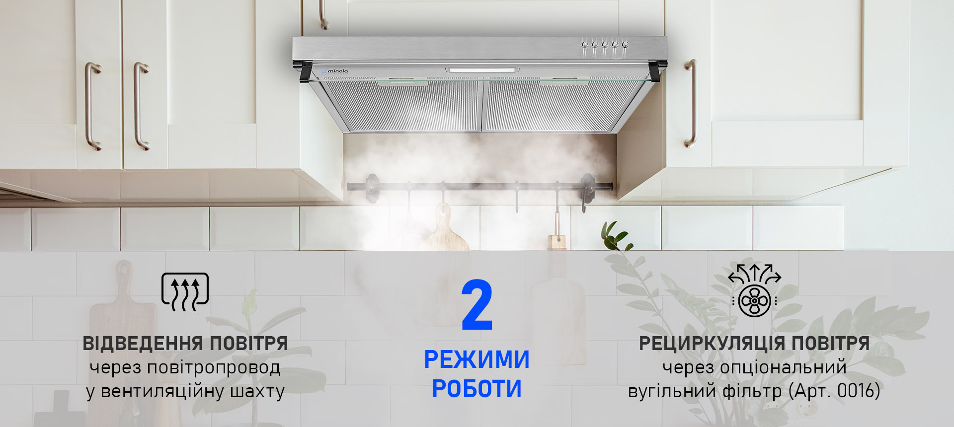 Режим відведення дозволяє Minola HPL 633 швидко видалити пар і запахи за межі кухні. У режимі рециркуляції витяжка фільтрує повітря та повертає його в приміщення, забезпечуючи чистоту навіть без підключення до вентиляції. Слід зазначити, що необхідний для режиму рециркуляції вугільний фільтр слід докупити окремо.