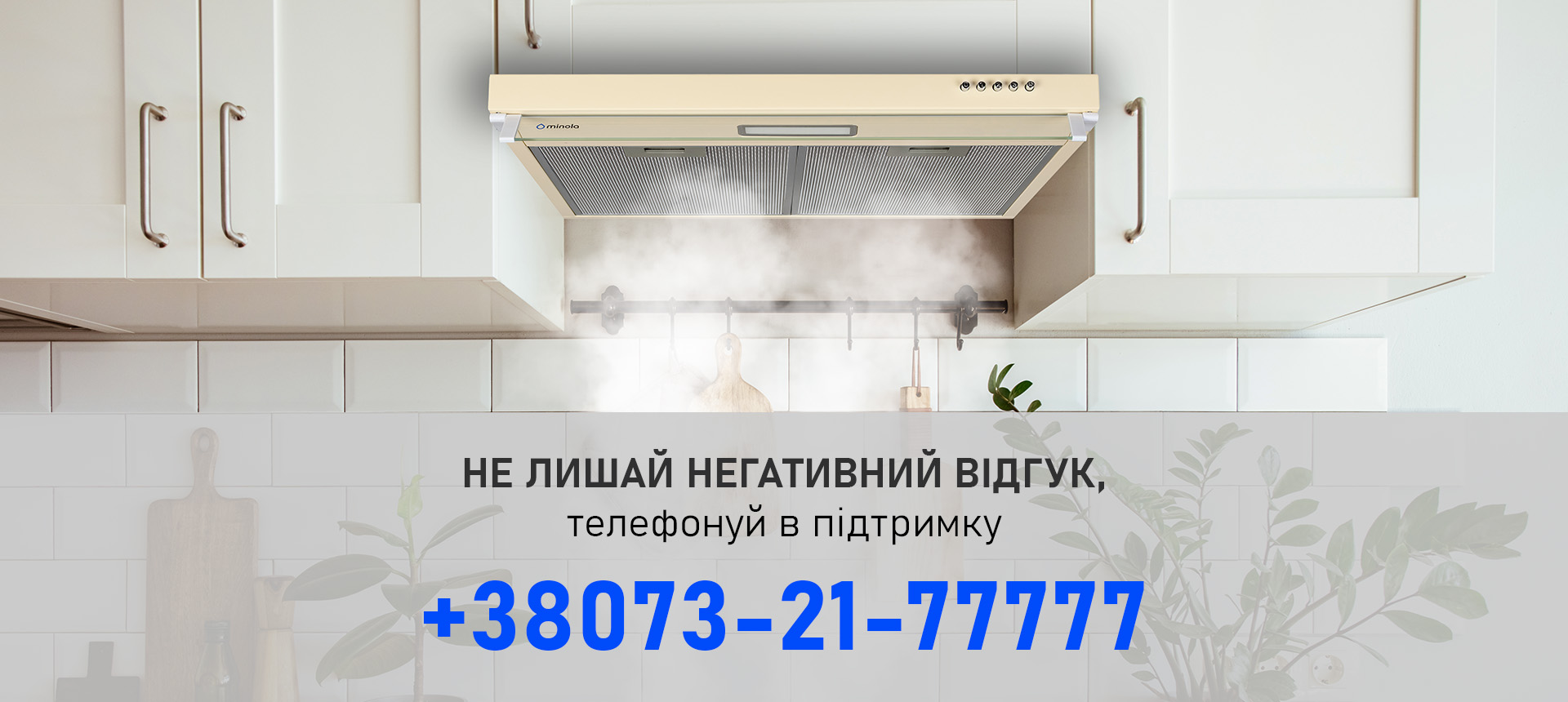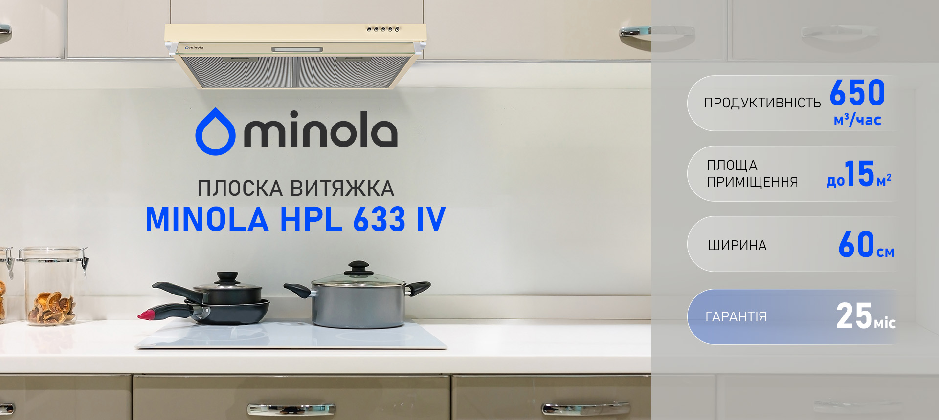 Minola надає 25 місяців гарантії на витяжки за умови дотримання правил монтажу та експлуатації, що вказані в інструкції. Гарантія поширюється на дефекти матеріалів і збірки.