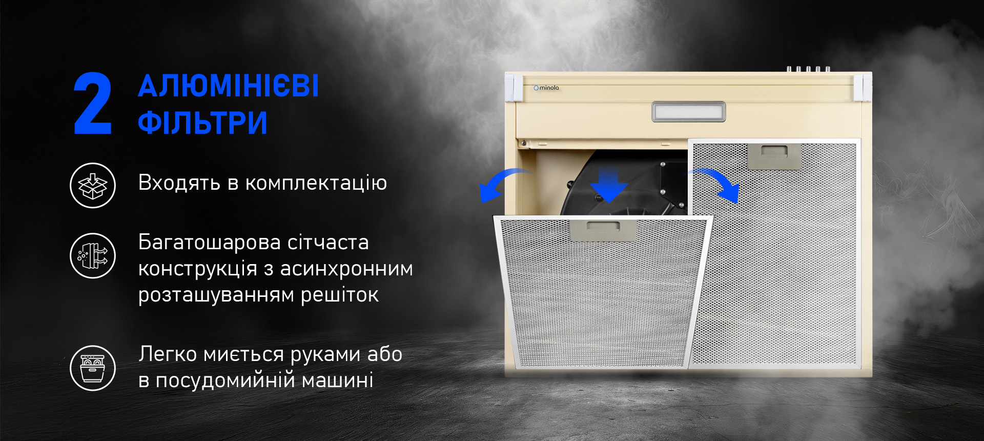 Витяжка Minola HPL 633 комплектується двома міцними алюмінієвими фільтрами. Вони допомагають підтримувати чистоту двигуна та запобігають втраті продуктивності пристрою.
