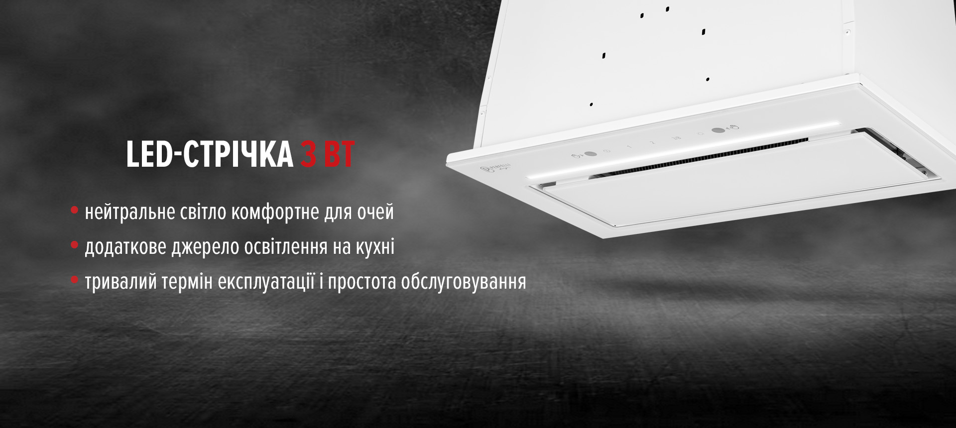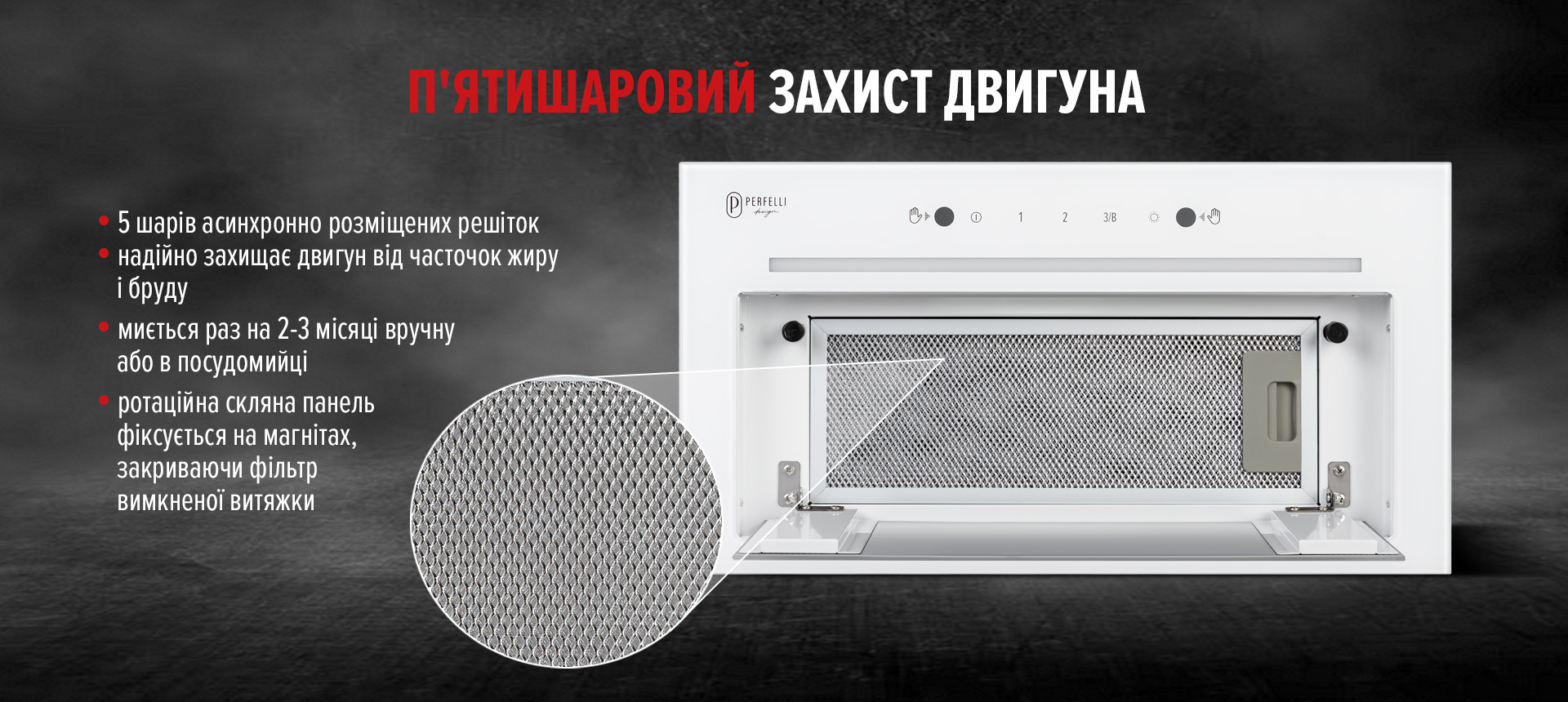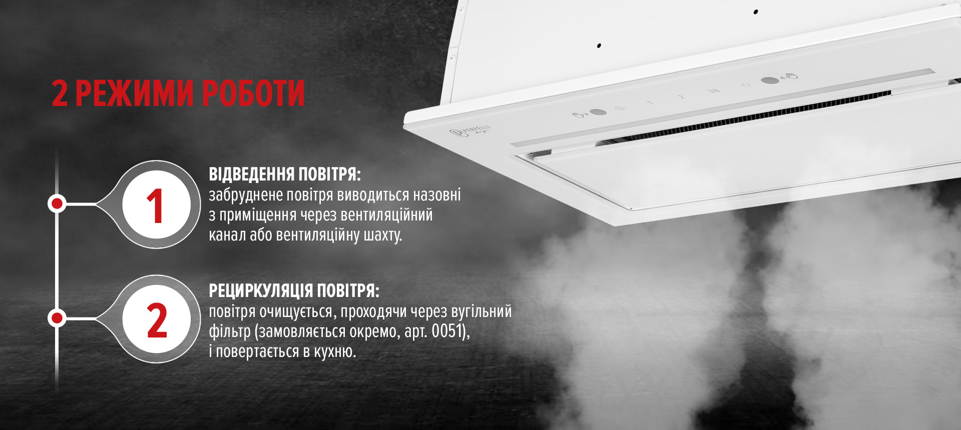 Скляна кришка перекриває зону фільтра, залишаючи невеликий зазор для забору повітря. Це дозволяє зберігати чистоту, простоту у прибиранні та візуальну легкість на кухні.