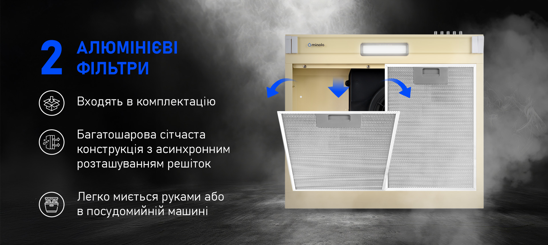 • Алюмінієві фільтри — багаторазові, легкомийні, з асинхронним розміщенням решіток.