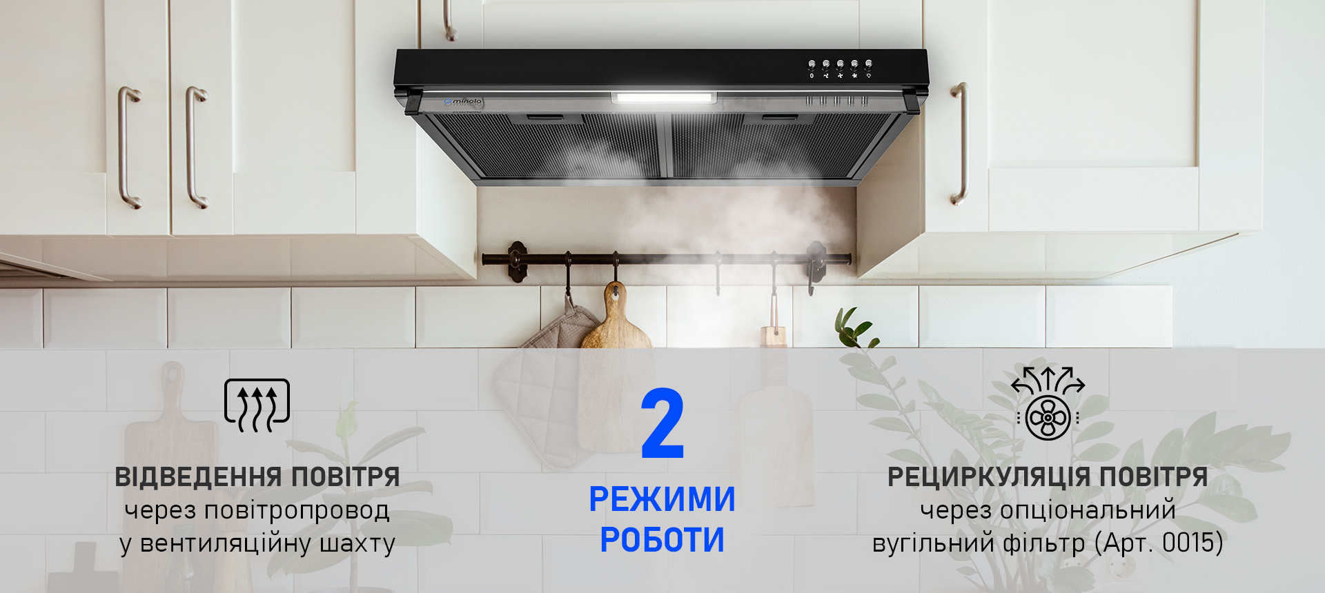- Рециркуляція — очищує повітря за допомогою вугільного фільтра (продається окремо) і повертає його назад у кухню.