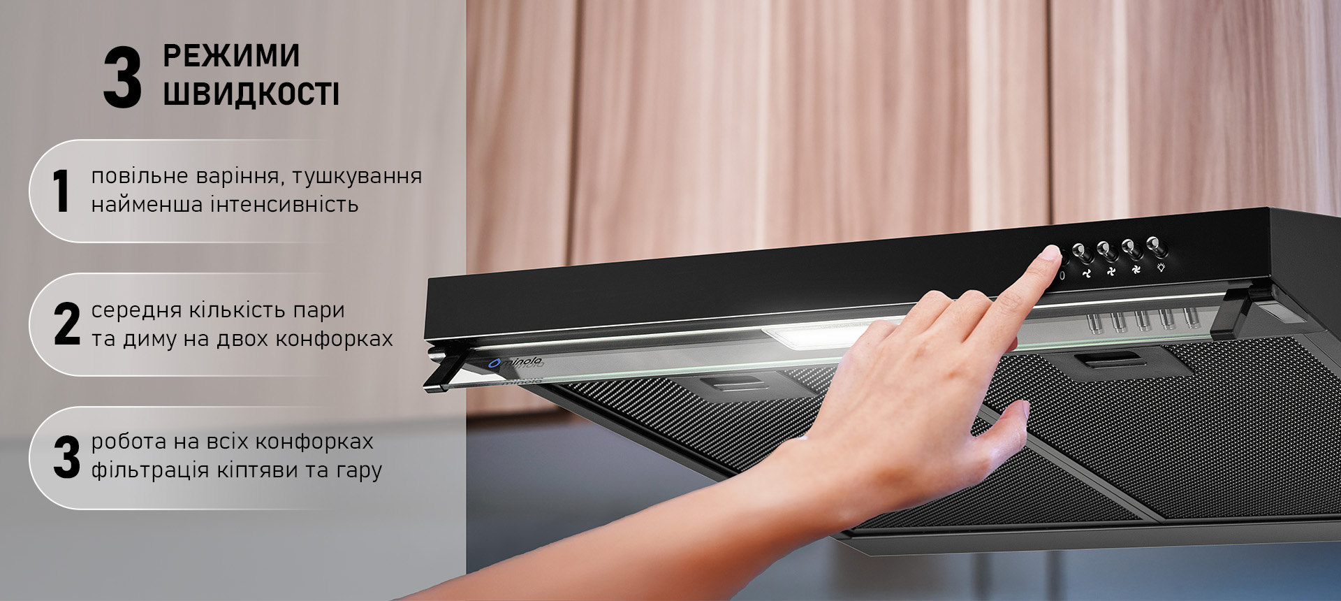 - Продуктивність 450 м³/год — ефективне усунення запахів, пари й жиру.