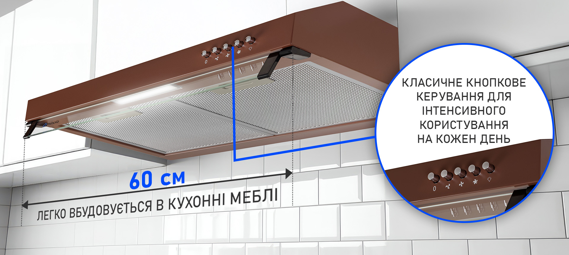 Корпус витяжки виконано з фарбованого у коричневий колір металу — це створює ефектний акцент в дизайні вашої кухні. Скляний козирок додає вишуканості і простий у очищенні.