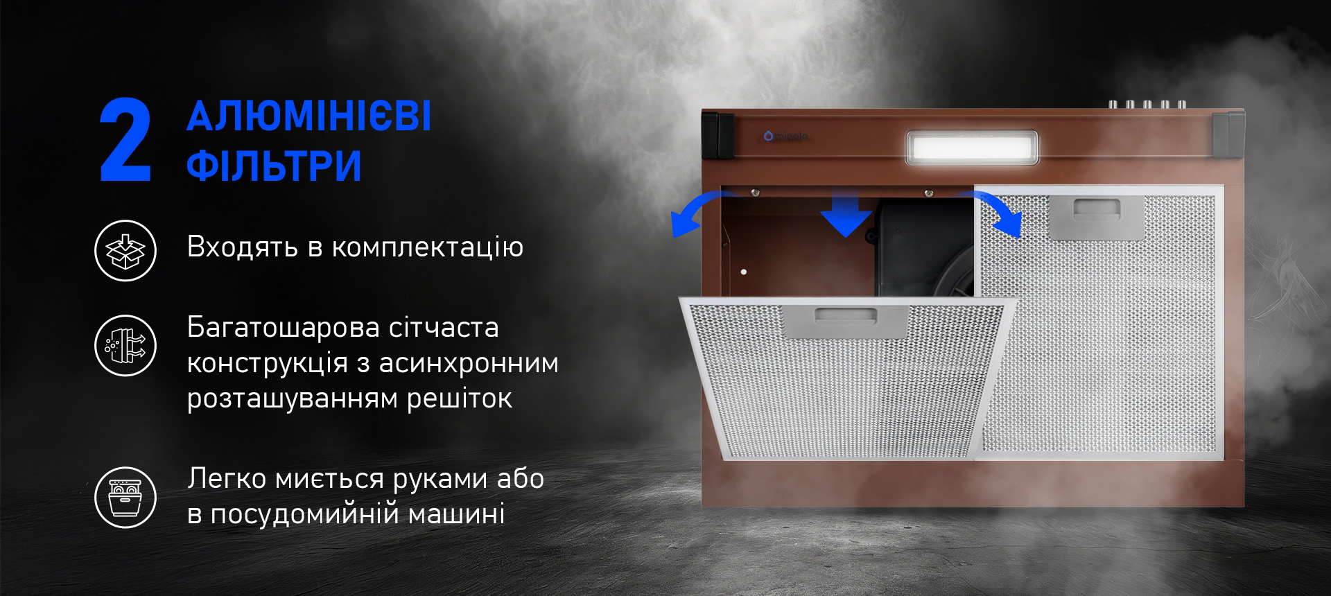 • 2 алюмінієві фільтри фільтрують повітря, не даючи потрапити волозі і часточкам жиру у двигун. Для обслуговування роботи витяжки достатньо раз на декілька місяців знімати фільтри і мити їх вручну або в посудомийці.