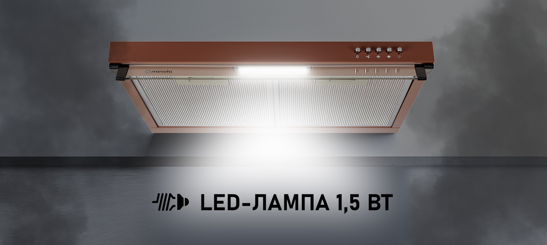 Minola HPL 622 BR — це плоска коричнева витяжка зі скляним козирком, що додає тепла у ваш інтер’єр. Вона забезпечує продуктивність 450 м³/год, добре освітлює робочу поверхню та створює комфортну атмосферу під час кулінарних експериментів. LED‑підсвітка випромінює м’яке світло й економить енергію. Надійна механічна панель керування проста у використанні навіть для новачків.