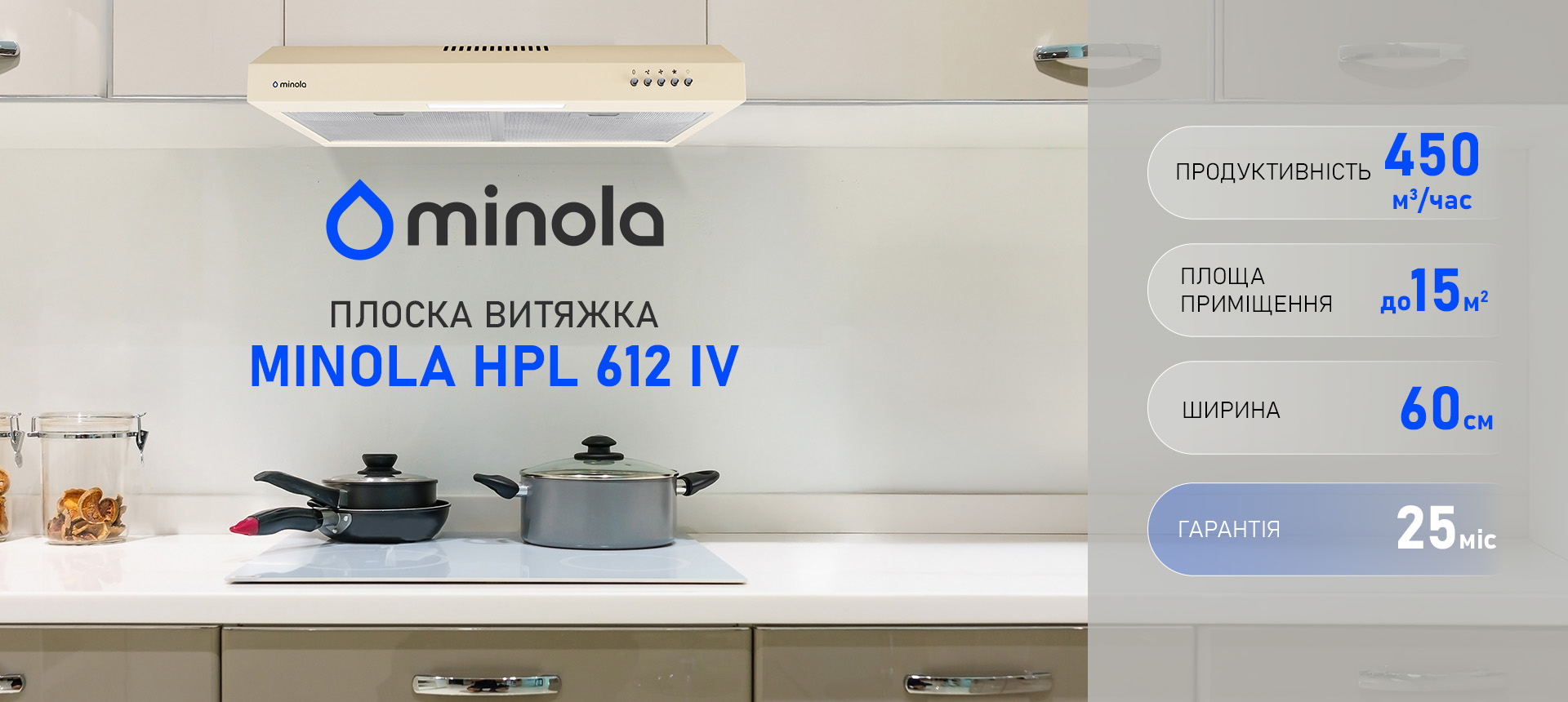 - Оптимальна ширина 595 мм дозволяє ефективно покривати плиту будь-яких стандартних розмірів, забезпечуючи якісне видалення запахів і пари.