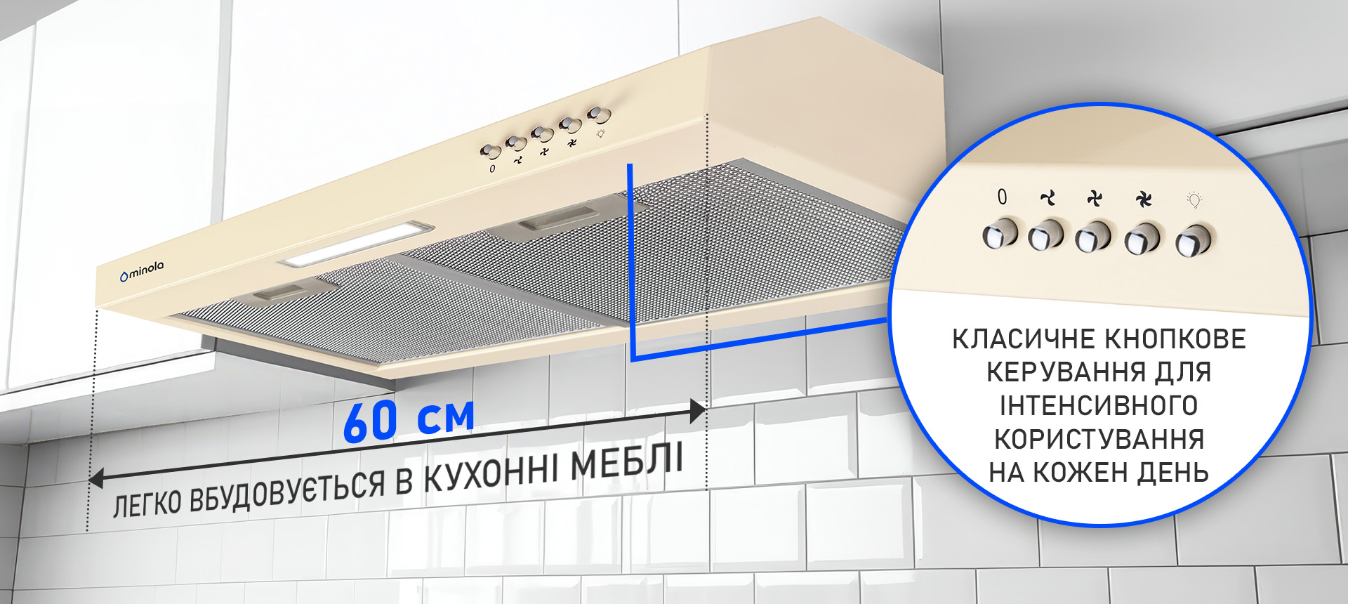 Корпус виготовлений із металу з якісним порошковим фарбуванням у колір айворі, що забезпечує стійкість до корозії, подряпин і вигорання. Плоска конструкція і елегантний світлий відтінок роблять витяжку стильним доповненням інтер’єру, підкреслюючи його легкість і гармонійність. Матеріали легко очищуються і довго зберігають привабливий вигляд навіть за умови активного використання.