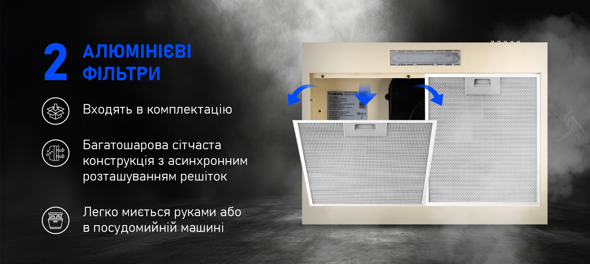 В комплекті йде багаторазові алюмінієві жировловлюючі фільтри, які легко очищуються і не вимагають особливого техобслуговування. Для рециркуляційного режиму рекомендується докупити вугільний фільтр, що ефективно усуває неприємні запахи і шкідливі домішки. Регулярна заміна вугільного фільтра (кожні 3-5 місяців) підтримує якість очищення повітря на високому рівні.