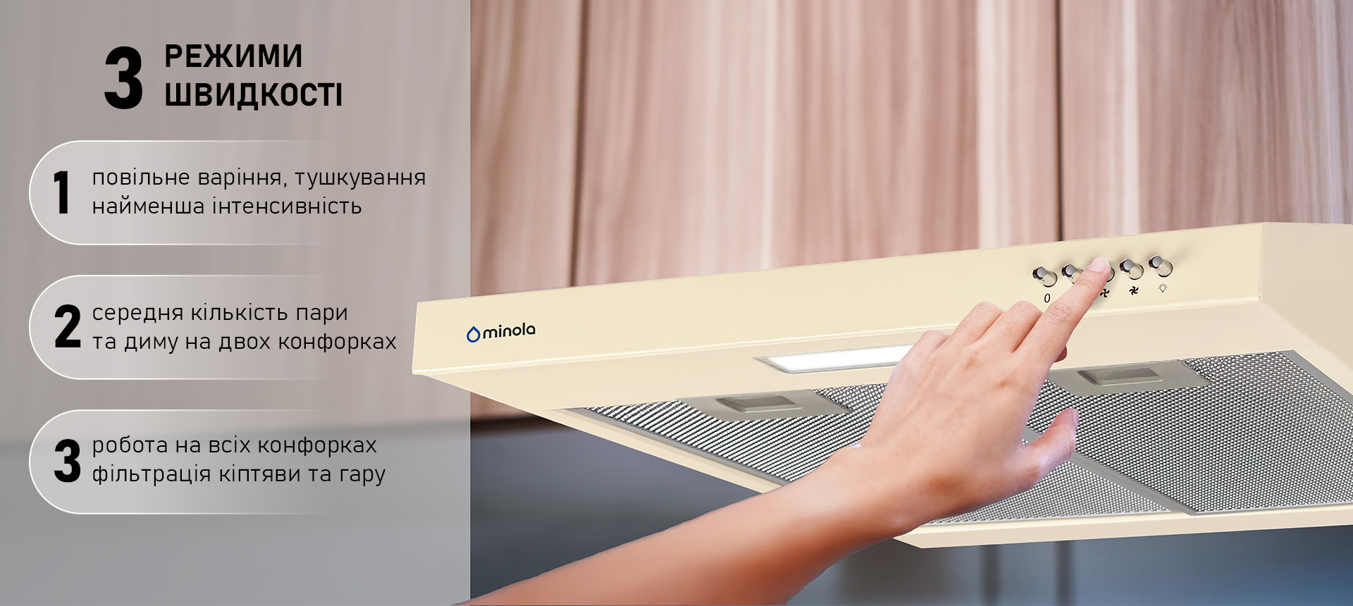 Максимальна продуктивність витяжки ефективно усуває запахи, пар і жир, навіть під час тривалого та активного приготування. Завдяки цьому повітря в кухні завжди залишається свіжим і чистим, а волога не накопичується, що запобігає появі плісняви та неприємних запахів. Витяжка здатна забезпечувати повітрообмін приблизно 10 разів на годину у приміщеннях до 20 м². Це сприяє комфортному перебуванню на кухні всієї родини.